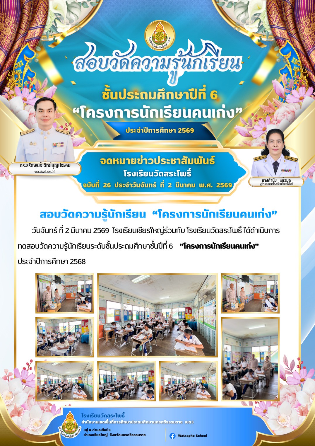สอบวัดความรู้นักเรียน “โครงการนักเรียนคนเก่ง” วันจันทร์ ที่ 2 มีนาคม 2569 โรงเรียนเชียรใหญ่ ร่วมกับ โรงเรียนวัดสระโพธิ์ ได้ดำเนินการ ทดสอบวัดความรู้นักเรียนระดับชั้นประถมศึกษาชั้นปีที่ 6 "โครงการนักเรียนคนเก่ง" ประจําปีการศึกษา...