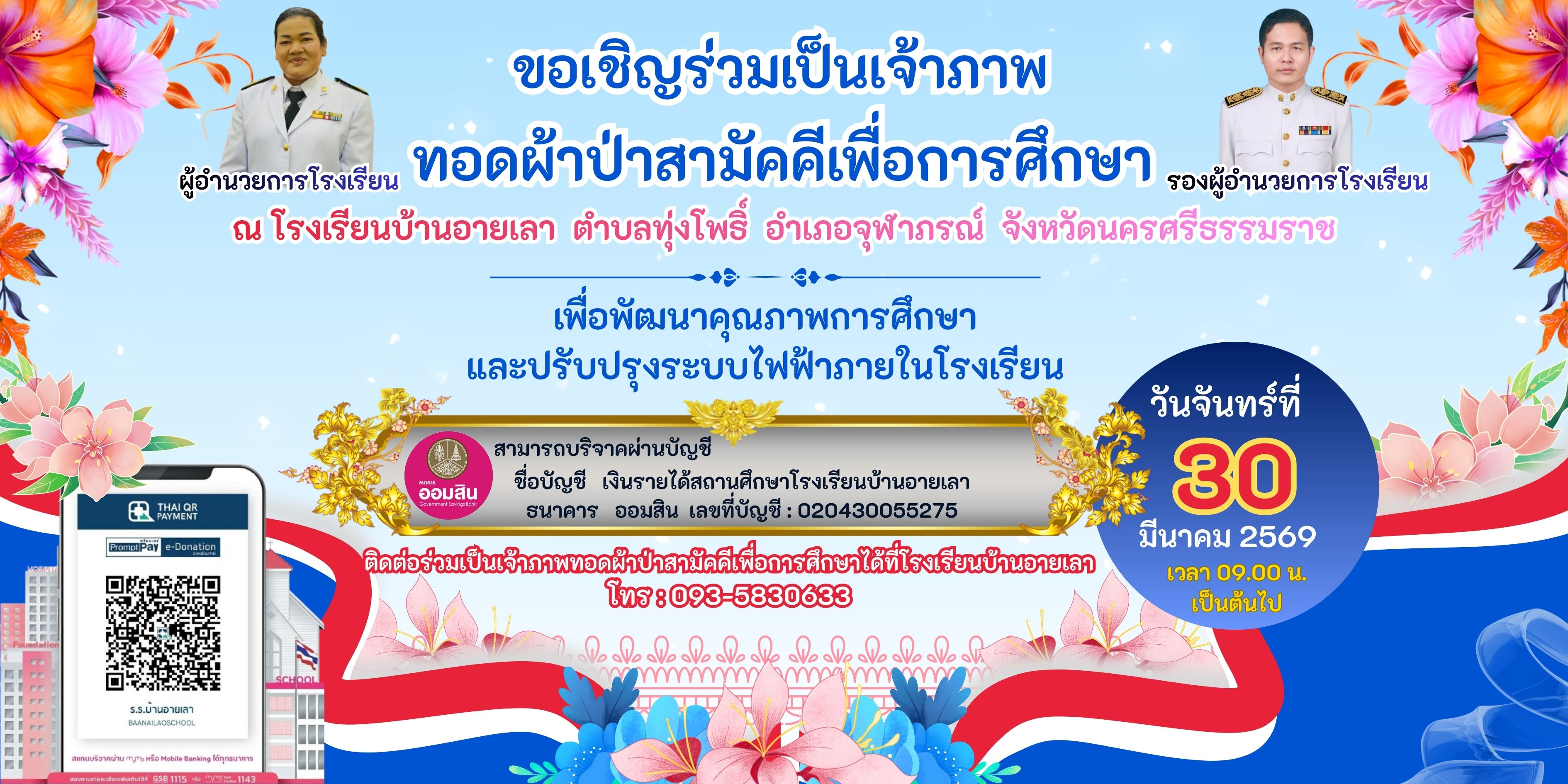 ขอเชิญผู้มีจิตศรัทธาร่วมทำบุญ ทอดผ้าป่าสามัคคีเพื่อการศึกษาโรงเรียนบ้านอายเลา เพื่อพัฒนาคุณภาพการศึกษา และปรับปรุงระบบไฟฟ้าภายในโรงเรียน