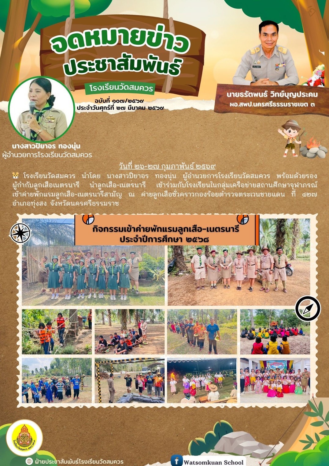 วันที่ ๒๖-๒๗ กุมภาพันธ์ ๒๕๖๙ โรงเรียนวัดสมควร นำโดย นางสาวปิยาอร ทองนุ่น ผู้อำนวยการโรงเรียนวัดสมควร พร้อมด้วยรอง ผู้กำกับลูกเสือเนตรนารี นำลูกเสือ-เนตรนารี เข้าร่วมกับโรงเรียนในกลุ่มเครือข่ายสถานศึกษาจุฬาภรณ์ เข้าค่ายพักแรมลูกเสือ-เนตรนารีสามัญ ณ...