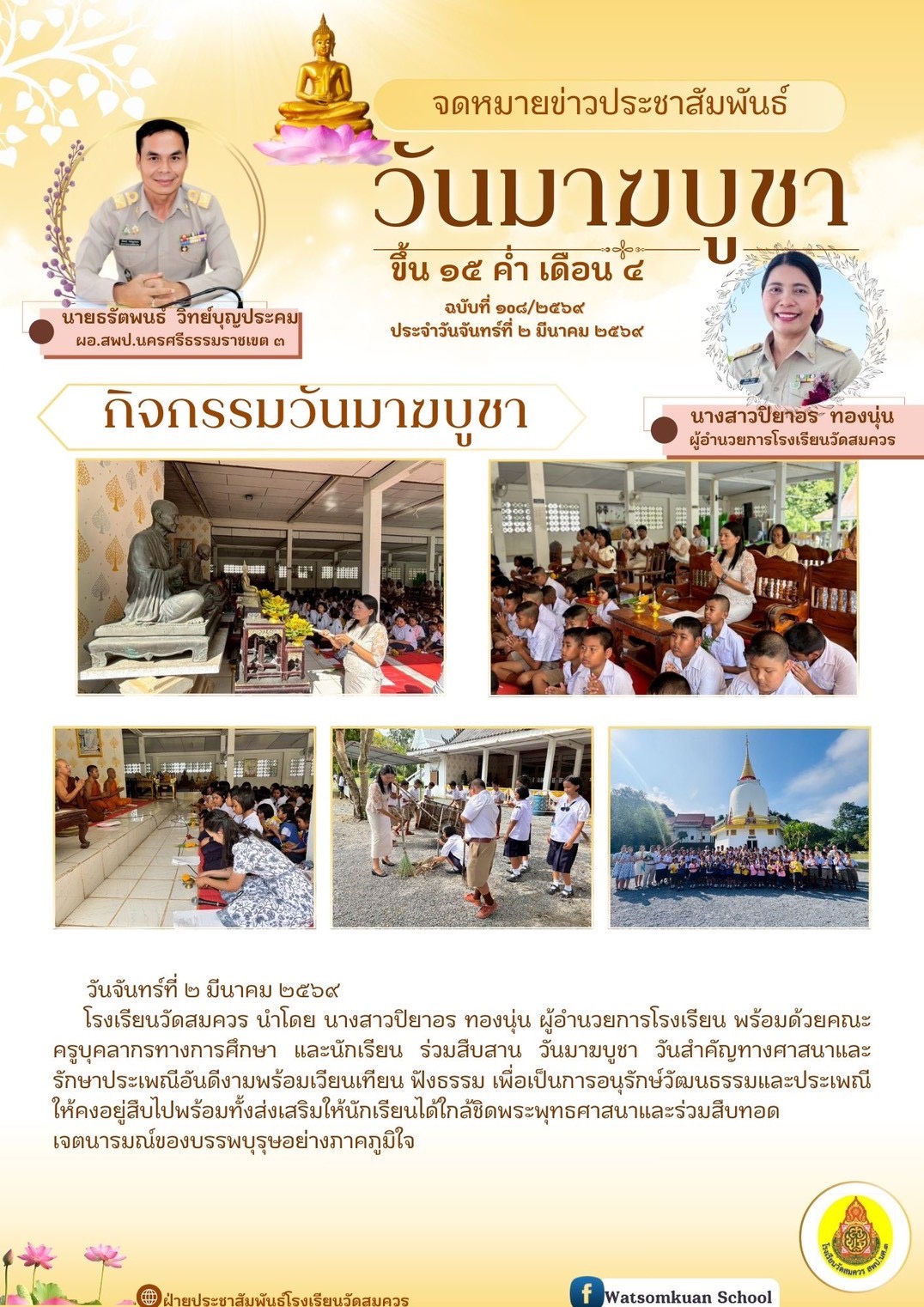 วันจันทร์ที่ ๒ มีนาคม ๒๕๖๙ โรงเรียนวัดสมควร นำโดย นางสาวปิยาอร ทองนุ่น ผู้อำนวยการโรงเรียน พร้อมด้วยคณะครูบุคลากรทางการศึกษา และนักเรียน ร่วมสืบสาน วันมาฆบูชา วันสำคัญทางศาสนาและรักษาประเพณีอันดีงามพร้อมเวียนเทียน ฟังธรรม...