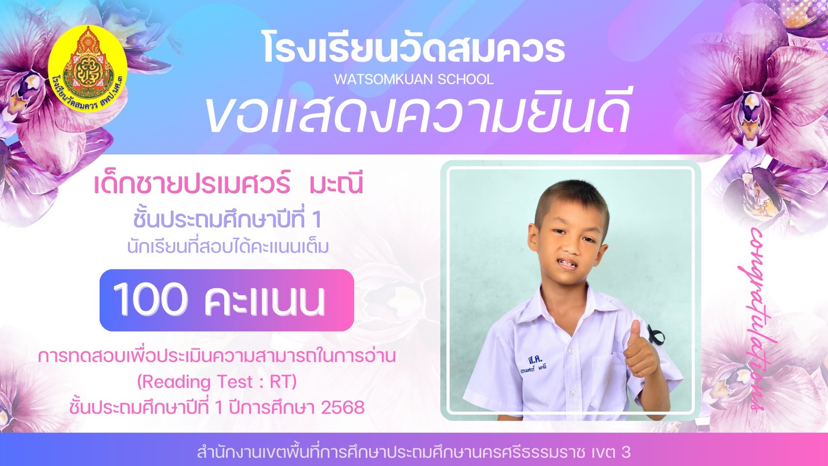 โรงเรียนวัดสมควร ขอแสดงความยินดีกับ เด็กชายปรเมศวร์ ม ะณี ชั้นประถมศึกษาปีที่ 1 นักเรียนที่สอบได้คะแนนเต็ม 100 คะแนน การทดสอบเพื่อประเมินความสามารถในการอ่าน (Reading Test :RT) ชั้นประถมศึกษาปีที่...