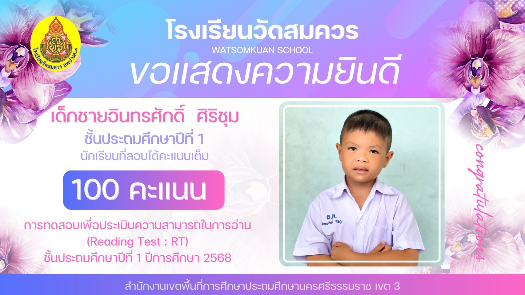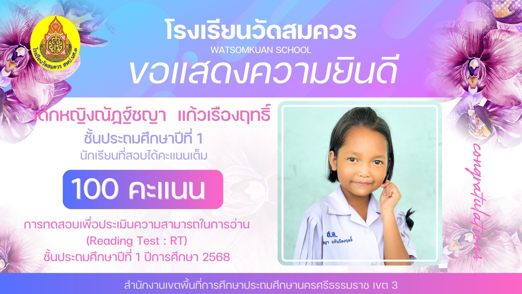 โรงเรียนวัดสมควร ขอแสดงความยินดีกับ เด็กหญิงณัฏฐ์ชญา แก้วเรืองฤทธิ์ ชั้นประถมศึกษาปีที่ 1 นักเรียนที่สอบได้คะแนนเต็ม 100 คะแนน การทดสอบเพื่อประเมินความสามารถในการอ่าน (Reading Test :RT) ชั้นประถมศึกษาปีที่ 1...