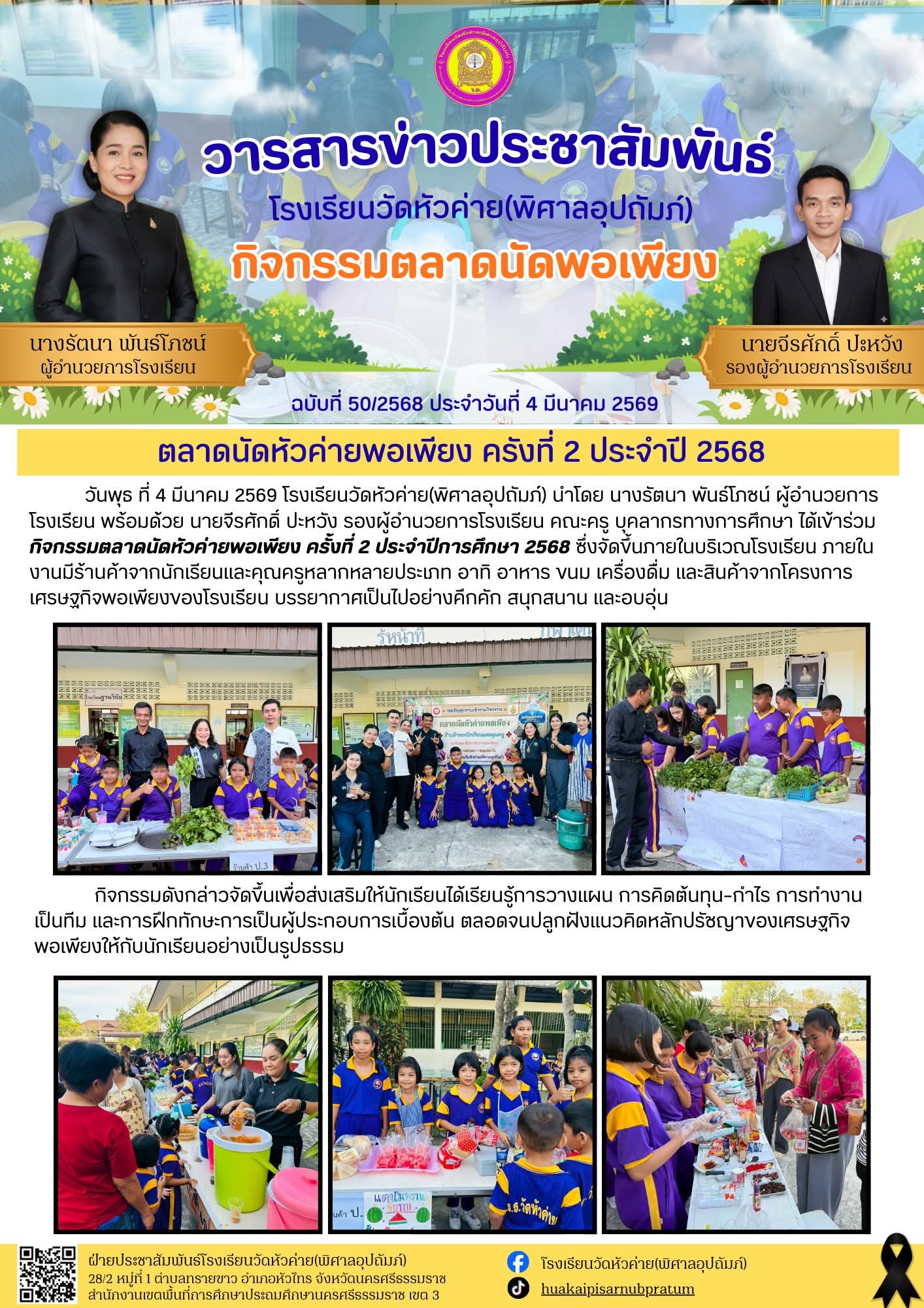 วันพุธ ที่ 4 มีนาคม 2569 โรงเรียนวัดหัวค่าย(พิศาลอุปถัมภ์) นำโดย นางรัตนา พันธ์โภชน์ ผู้อำนวยการโรงเรียน พร้อมด้วย นายจีรศักดิ์ ปะหวัง รองผู้อำนวยการโรงเรียน คณะครู...