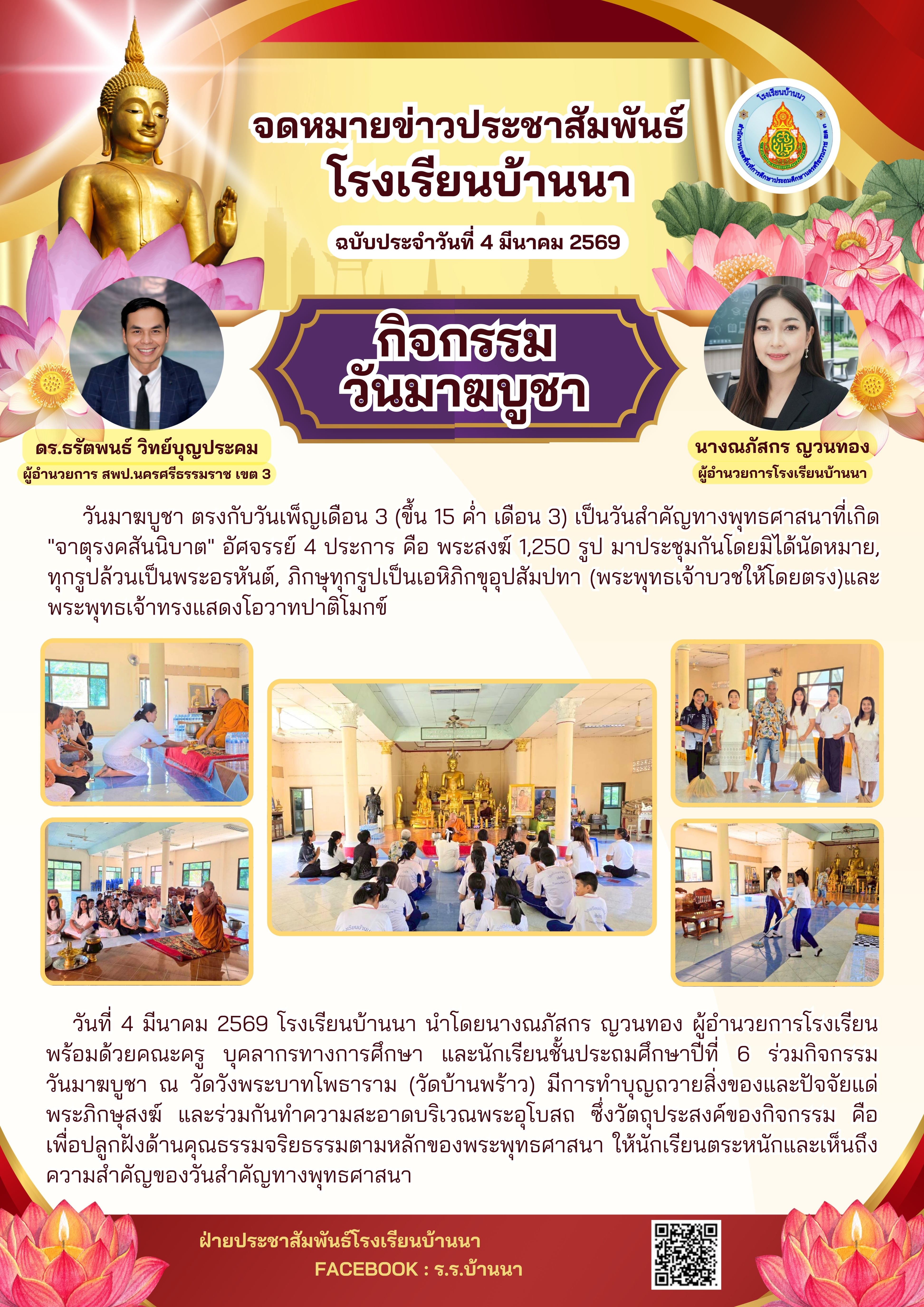 วันที่ 4 มีนาคม 2569 โรงเรียนบ้านนา นำโดยนางณภัสกร ญวนทอง ผู้อำนวยการโรงเรียน พร้อมด้วยคณะครู บุคลากรทางการศึกษา และนักเรียนชั้นประถมศึกษาปีที่ 6 ร่วมกิจกรรมวันมาฆบูชา ณ วัดวังพระบาทโพธาราม...