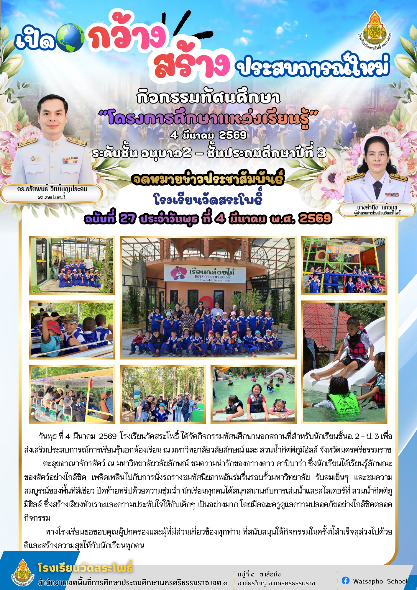 วันพุธ ที่ 4 มีนาคม 2569 โรงเรียนวัดสระโพธิ์ ได้จัดกิจกรรมทัศนศึกษานอกสถานที่สำหรับนักเรียนชั้นอ. 2 - ป.3 เพื่อส่งเสริมประสบการณ์การเรียนรู้นอกห้องเรียน ณ มหาวิทยาลัยวลัยลักษณ์ และ สวนน้ำกิตติภูมิฮิลล์...