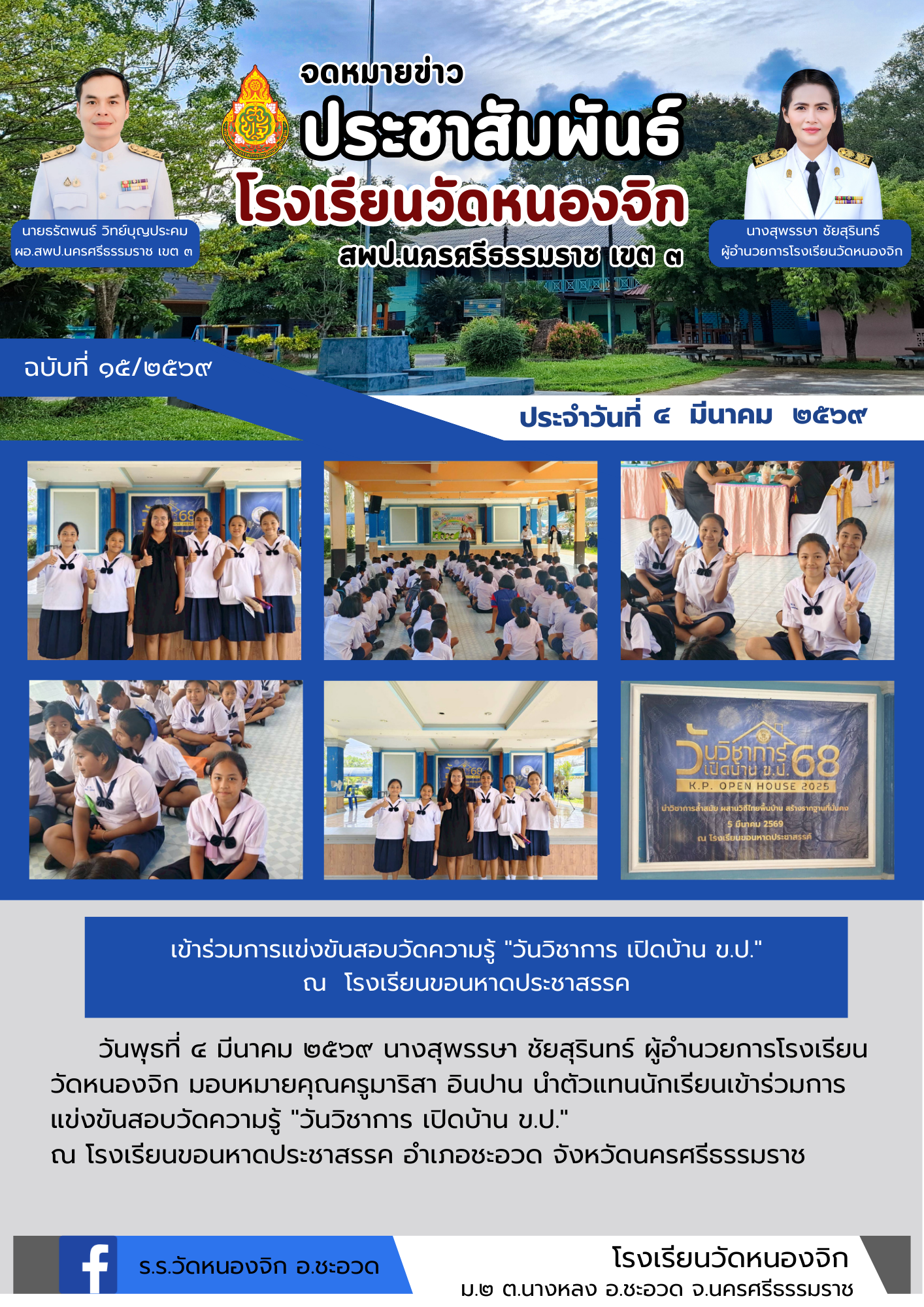 วันพุธที่ ๔ มีนาคม ๒๕๖๙ นางสุพรรษา ชัยสุรินทร์ ผู้อำนวยการโรงเรียนวัดหนองจิก มอบหมายคุณครูมาริสา อินปาน นำตัวแทนนักเรียนเข้าร่วมการแข่งขันสอบวัดความรู้ "วันวิชาการ เปิดบ้าน ข.ป." ณ โรงเรียนขอนหาดประชาสรรค...