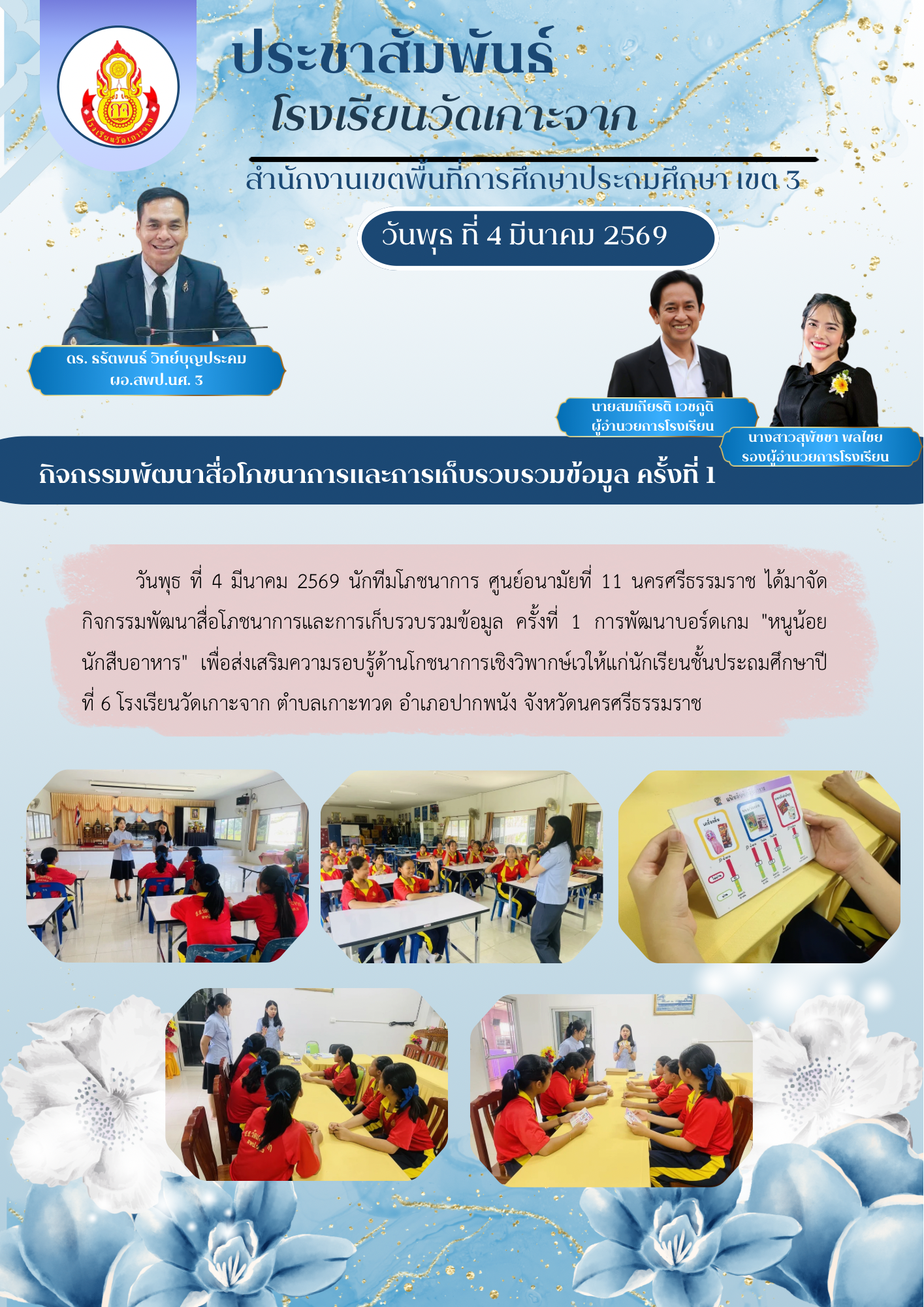 วันพุธ ที่ 4 มีนาคม 2569 นักทีมโภชนาการ ศูนย์อนามัยที่ 11 นครศรีธรรมราช ได้มาจัดกิจกรรมพัฒนาสื่อโภชนาการและการเก็บรวบรวมข้อมูล ครั้งที่ 1 การพัฒนาบอร์ดเกม "หนูน้อยนักสืบอาหาร" เพื่อส่งเสริมความรอบรู้ด้านโกชนาการเชิงวิพากษ์เวให้แก่นักเรียนชั้นประถมศึกษาปีที่...