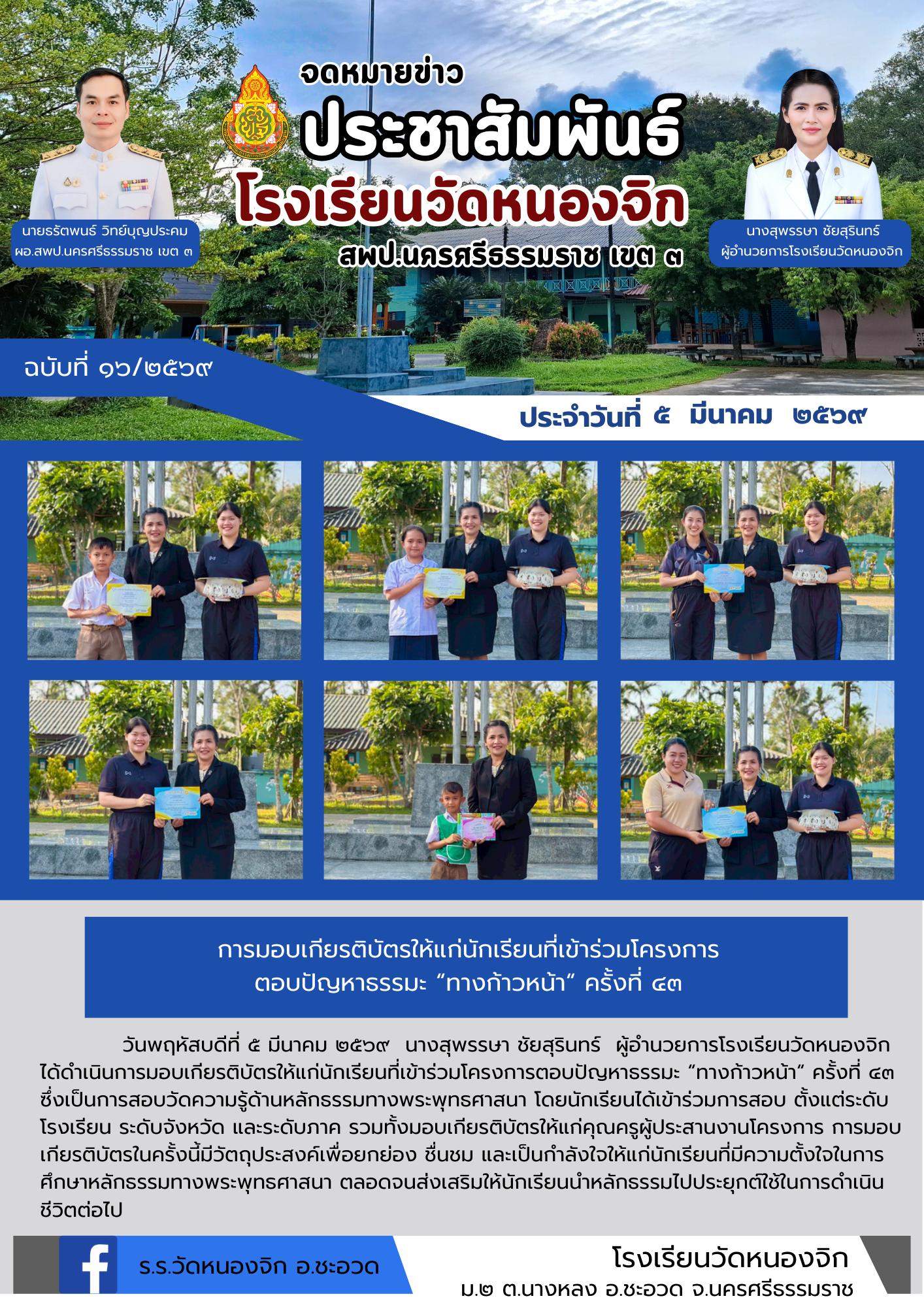 วันพฤหัสบีที่ ๕ มีนาคม ๒๕๖๙ นางสุพรรษา ชัยสุรินทร์ ผู้อำนวยการโรงเรียนวัดหนองจิก ได้ดำเนินการมอบเกียรติบัตรให้แก่นักเรียนที่เข้าร่วมโครงการตอบปัญหาธรรมะ “ทางก้าวหน้า“ ครั้งที่ ๔๓ ซึ่งเป็นการสอบวัดความรู้ด้านหลักธรรมทางพระพุทธศาสนา โดยนักเรียนได้เข้าร่วมการสอบ ตั้งแต่ระดับโรงเรียน ระดับจังหวัด...