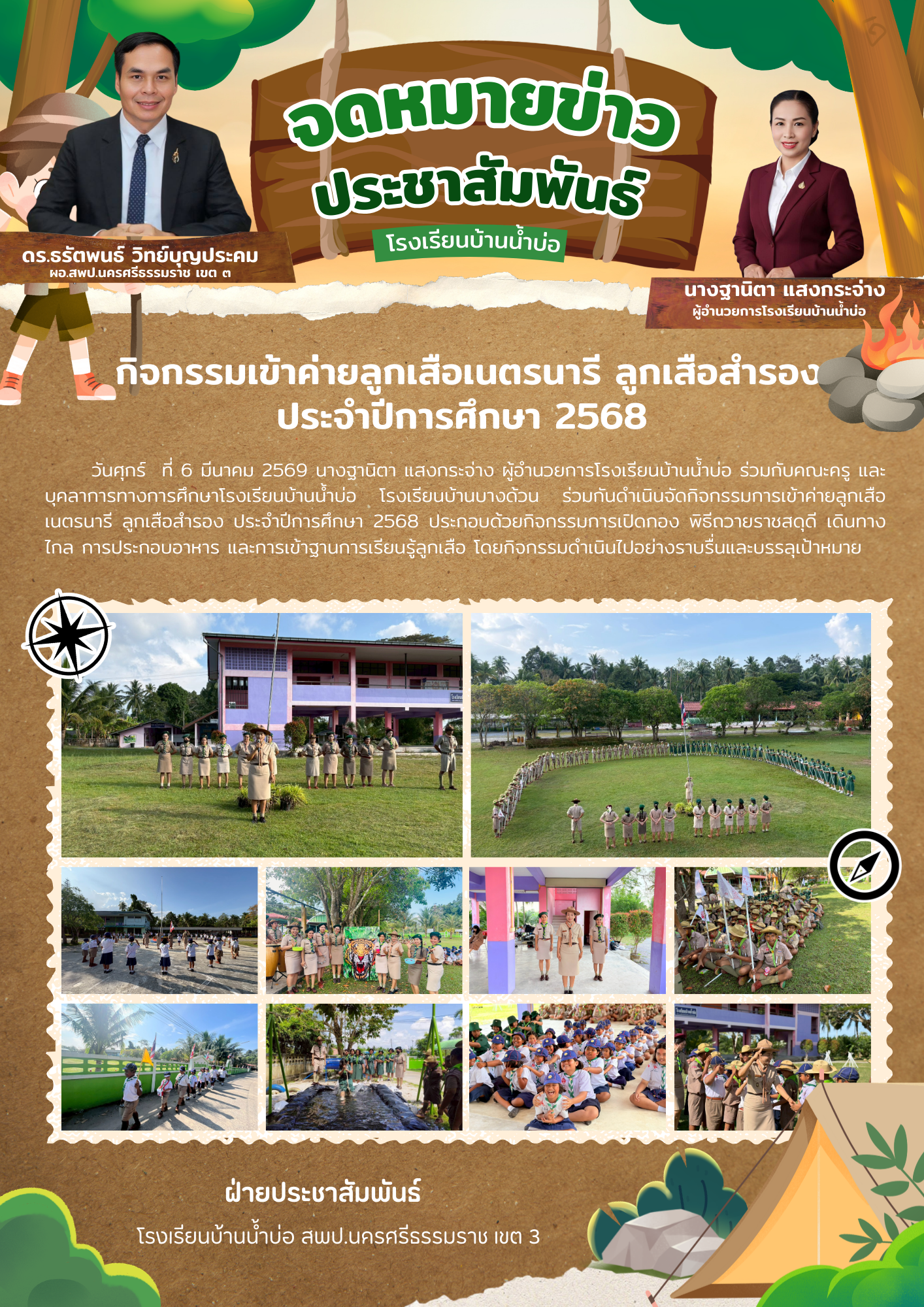 วันศุกร์ ที่ 6 มีนาคม 2569 นางฐานิตา แสงกระจ่าง ผู้อำนวยการโรงเรียนบ้านน้ำบ่อ ร่วมกับคณะครู และบุคลาการทางการศึกษาโรงเรียนบ้านน้ำบ่อ โรงเรียนบ้านบางด้วน ร่วมกันดำเนินจัดกิจกรรมการเข้าค่ายลูกเสือเนตรนารี ลูกเสือสำรอง ประจำปีการศึกษา 2568...