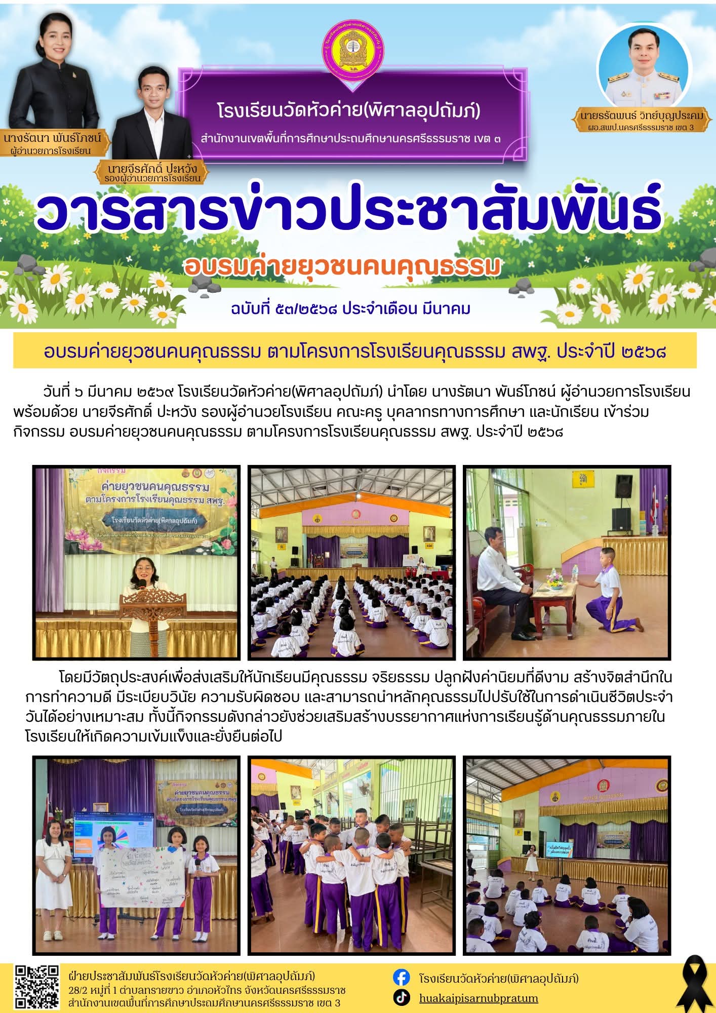 วันที่ ๖ มีนาคม ๒๕๖๙ โรงเรียนวัดหัวค่าย(พิศาลอุปถัมภ์) นำโดย นางรัตนา พันธ์โภชน์ ผู้อำนวยการโรงเรียน พร้อมด้วย นายจีรศักดิ์ ปะหวัง รองผู้อำนวยโรงเรียน คณะครู บุคลากรทางการศึกษา...