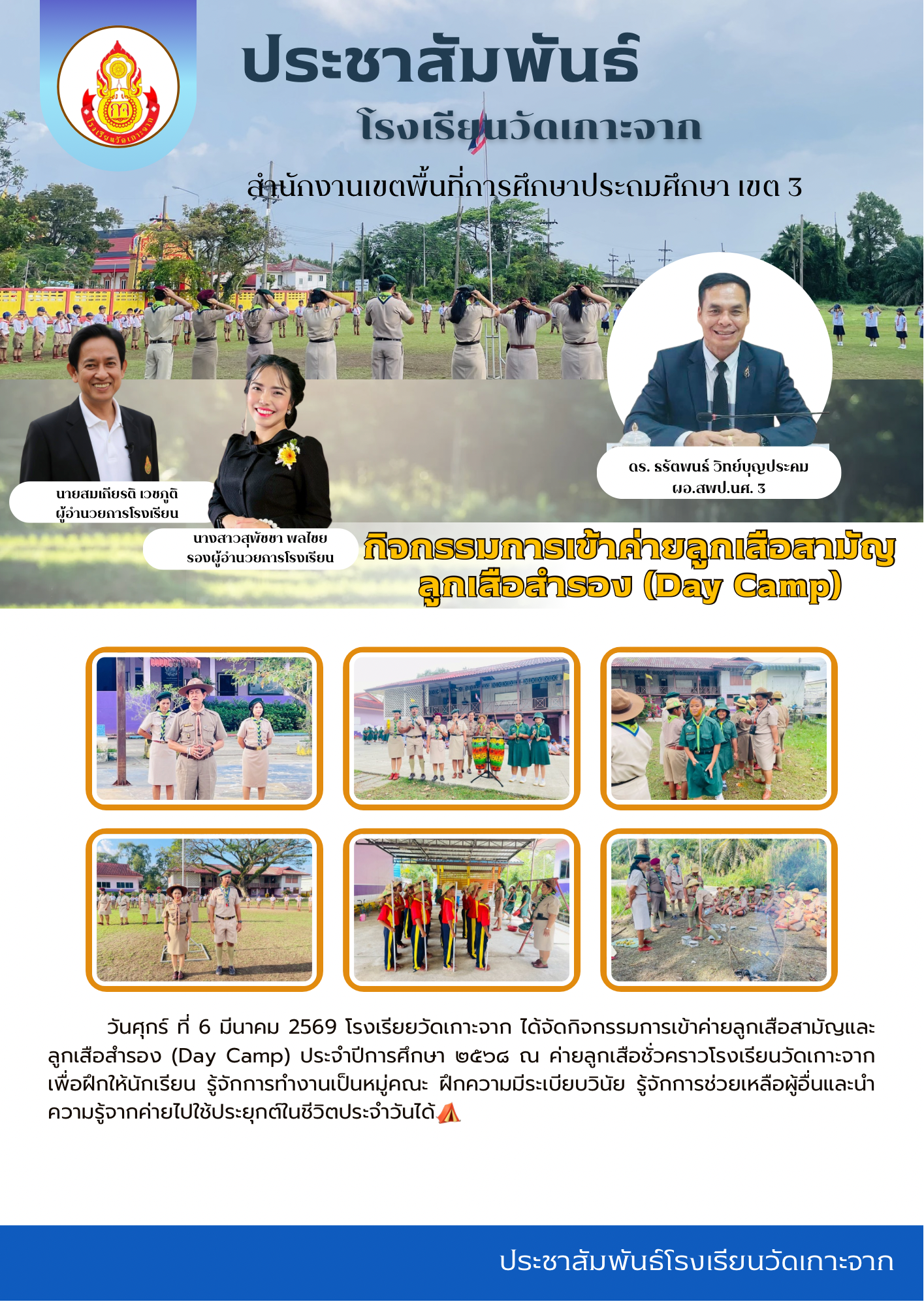วันศุกร์ ที่ 6 มีนาคม 2569 โรงเรียนวัดเกาะจาก ได้จัดกิจกรรมการเข้าค่ายลูกเสือสามัญและลูกเสือสำรอง (Day Camp) ประจำปีการศึกษา ๒๕๖๘ ณ ค่ายลูกเสือชั่วคราวโรงเรียนวัดเกาะจาก เพื่อฝึกให้นักเรียน รู้จักการทำงานเป็นหมู่คณะ...