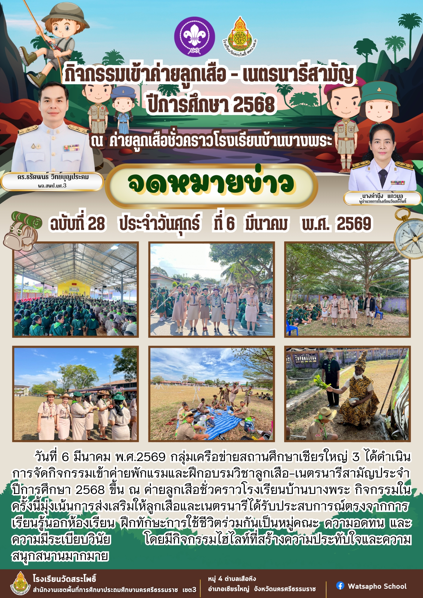 วันที่ 6 มีนาคม พ.ศ.2569 กลุ่มเครือข่ายสถานศึกษาเชียรใหญ่ 3 ได้ดำเนิน การจัดกิจกรรมเข้าค่ายพักแรมและฝึกอบรมวิชาลูกเสือ-เนตรนารีสามัญประจำ ปีการศึกษา 2568 ขึ้น ณ ค่ายลูกเสือชั่วคราวโรงเรียนบ้านบางพระ กิจกรรมใน ครั้งนี้มุ่งเน้นการส่งเสริมให้ลูกเสื้อและเนตรนารีได้รับประสบการณ์ตรงจากการ...