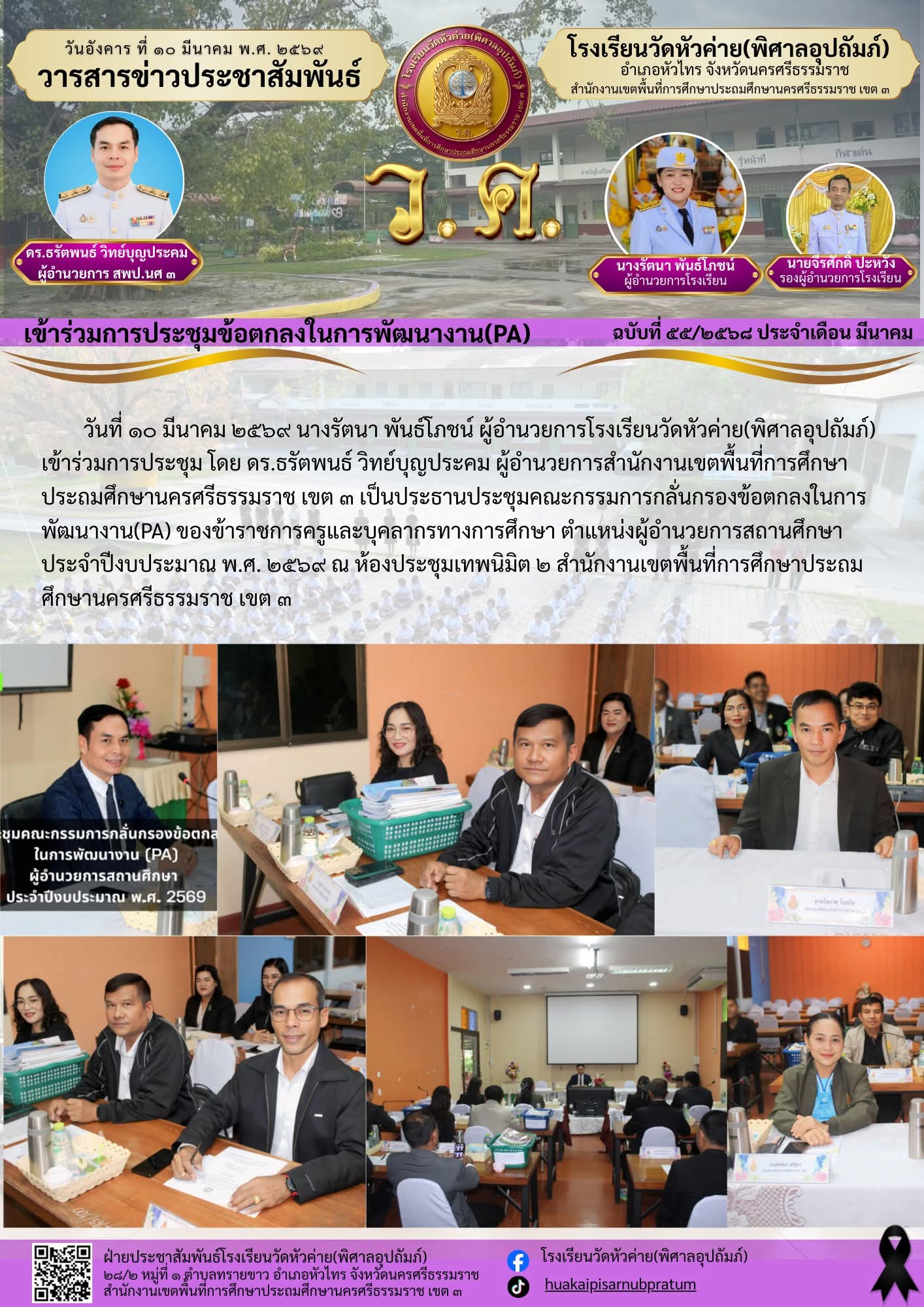 วันที่ ๑๐ มีนาคม ๒๕๖๙ นางรัตนา พันธ์โภชน์ ผู้อำนวยการโรงเรียนวัดหัวค่าย(พิศาลอุปถัมภ์) เข้าร่วมการประชุม โดย ดร.ธรัตพนธ์ วิทย์บุญประคม ผู้อำนวยการสำนักงานเขตพื้นที่การศึกษาประถมศึกษานครศรีธรรมราช เขต ๓ เป็นประธานประชุมคณะกรรมการกลั่นกรองข้อตกลงในการพัฒนางาน(PA)...