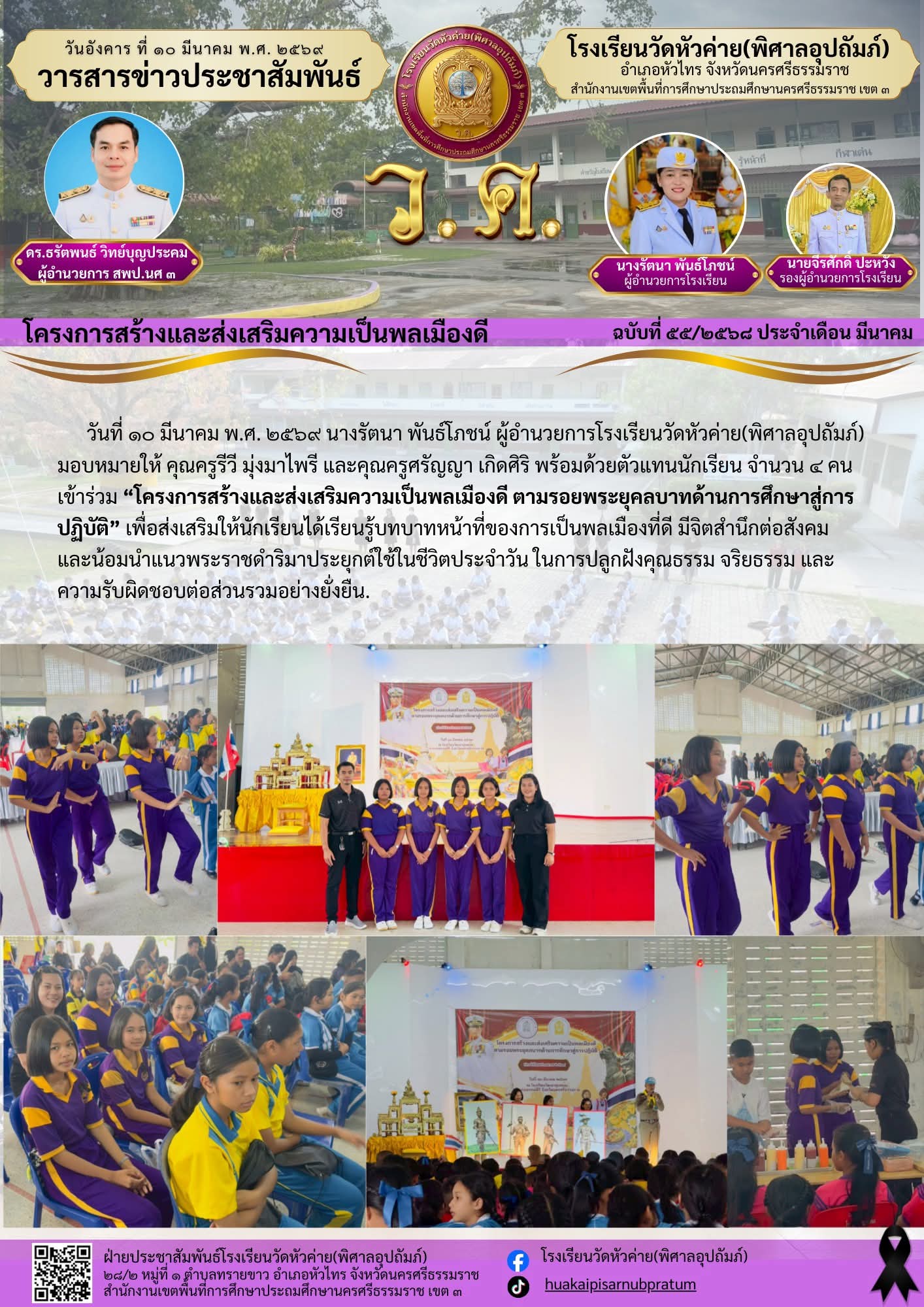 วันที่ ๑๐ มีนาคม พ.ศ. ๒๕๖๙ นางรัตนา พันธ์โภชน์ ผู้อำนวยการโรงเรียนวัดหัวค่าย(พิศาลอุปถัมภ์) มอบหมายให้ คุณครูรีวี มุ่งมาไพรี และคุณครูศรัญญา เกิดศิริ พร้อมด้วยตัวแทนนักเรียน จำนวน...