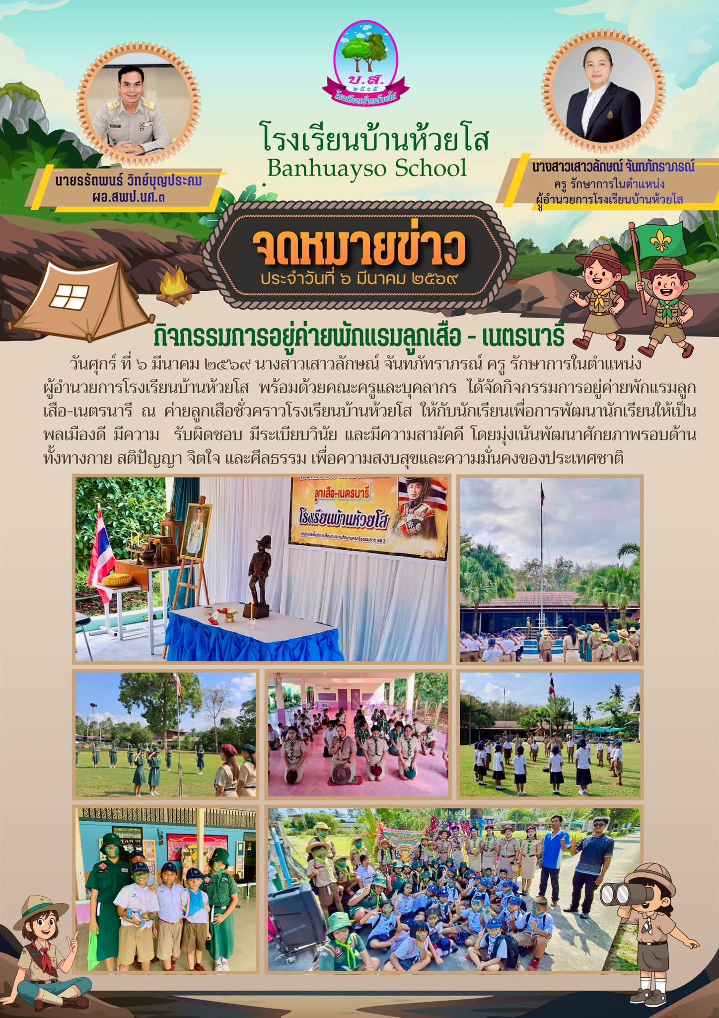 นางสาวเสาวลักษณ์ จันทภัทราภรณ์ ครู รักษาการในตำแหน่งผู้อำนวยการโรงเรียนบ้านห้วยโส พร้อมด้วยคณะครูและบุคลากร ได้จัดกิจกรรมการอยู่ค่ายพักแรมลูกเสือ-เนตรนารี ณ ค่ายลูกเสือชั่วคราวโรงเรียนบ้านห้วยโส ให้กับนักเรียนเพื่อการพัฒนานักเรียนให้เป็นพลเมืองดี มีความ รับผิดชอบ มีระเบียบวินัย และมีความสามัคคีโดยมุ่งเน้นพัฒนาศักยภาพรอบด้านทั้งทางกาย สติปัญญา จิตใจ...