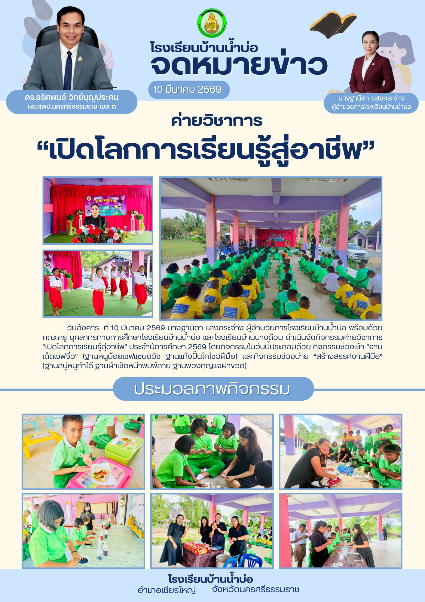 วันอังคาร ที่ 10 มีนาคม 2569 นางฐานิตา แสงกระจ่าง ผู้อำนวยการโรงเรียนบ้านน้ำบ่อ พร้อมด้วยคณะครู บุคลากรทางการศึกษาโรงเรียนบ้านน้ำบ่อ และโรงเรียนบ้านบางด้วน ดำเนินจัดกิจกรรมค่ายวิชาการ “เปิดโลกการเรียนรู้สู่อาชีพ” ประจำปีการศึกษา 2569...