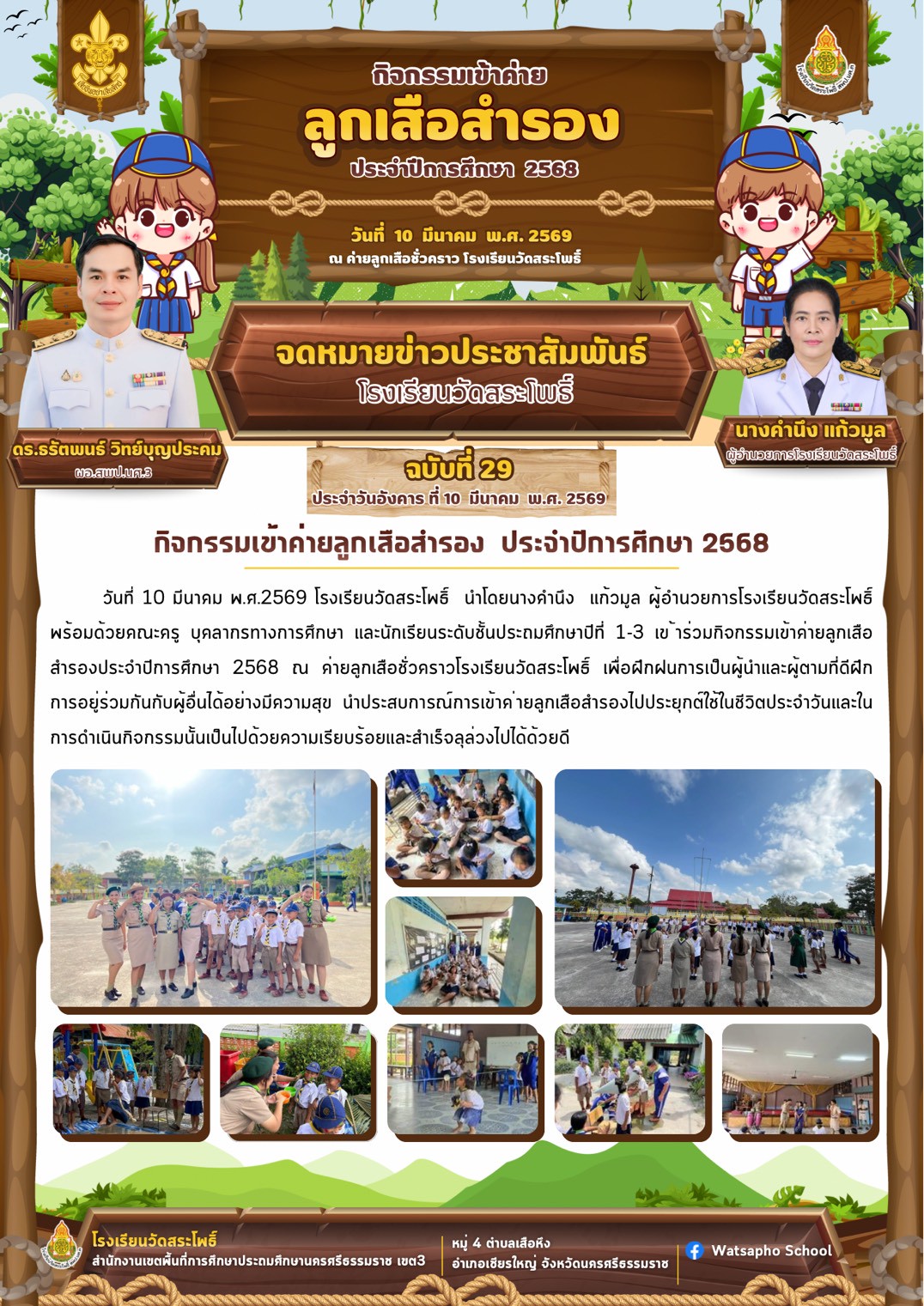 วันที่ 10 มีนาคม พ.ศ.2569 โรงเรียนวัดสระโพธิ์ นำโดยนางคำนึง แก้วมูล ผู้อำนวยการโรงเรียนวัดสระโพธิ์ พร้อมด้วยคณะครู บุคลากรทางการศึกษา และนักเรียนระดับชั้นประถมศึกษาปีที่ 1-3 เข้าร่วมกิจกรรมเข้าค่ายลูกเสือสํารองประจําปีการศึกษา 2568 ณ...