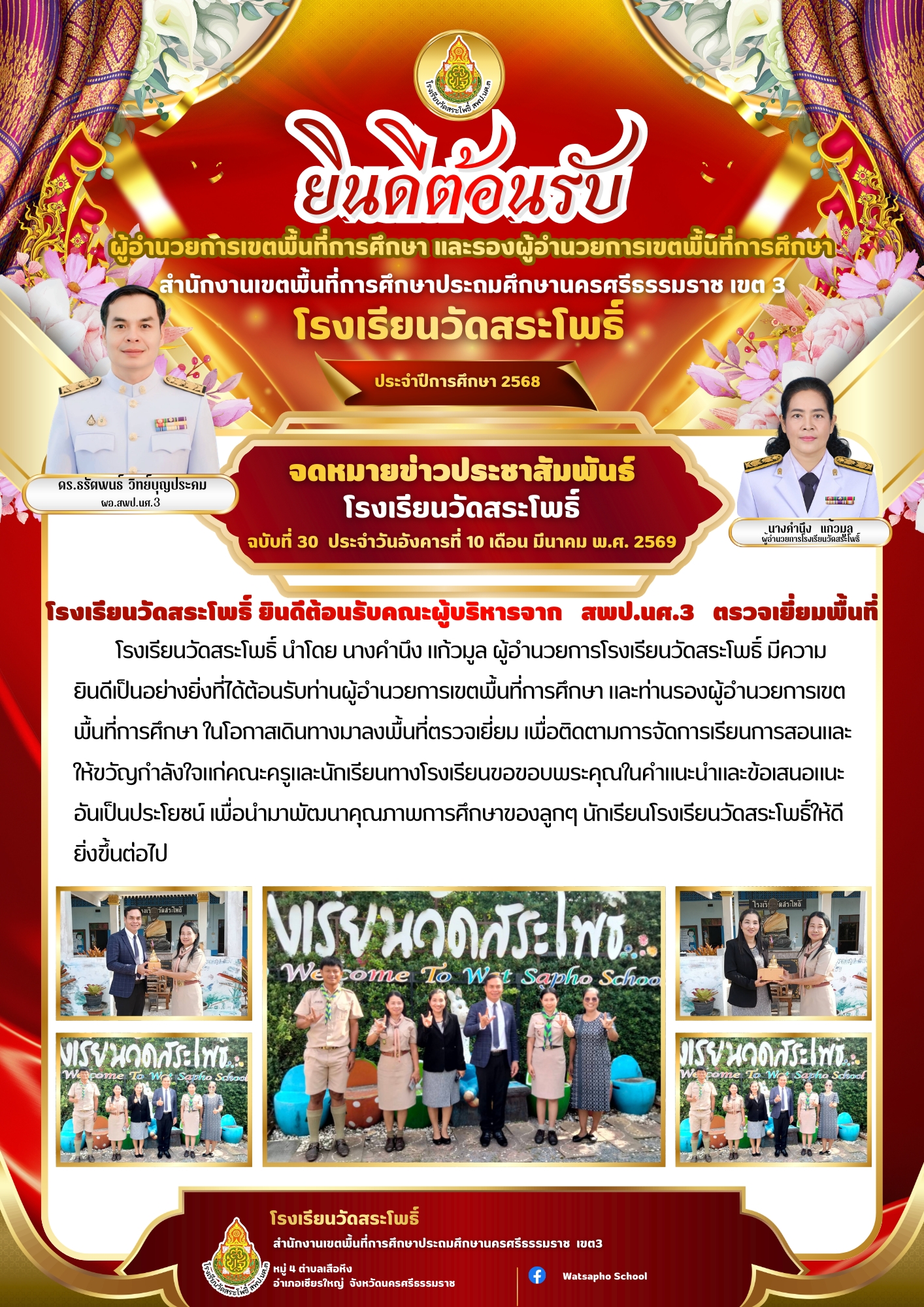 โรงเรียนวัดสระโพธิ์ นำโดย นางคำนึง แก้วมูล ผู้อำนวยการโรงเรียนวัดสระโพธิ์ มีความยินดีเป็นอย่างยิ่งที่ได้ต้อนรับท่านผู้อำนวยการสำนักงานเขตพื้นที่การศึกษาประถมศึกษานครศรีธรรมราช เขต 3 นายธรัตพนธ์ วิทย์บุญประคม และ นางประทุมมาส รู้ยิ่ง รองผู้อำนวยการเขตพื้นที่การศึกษาประถมศึกษานครศรีธรรมราช เขต...