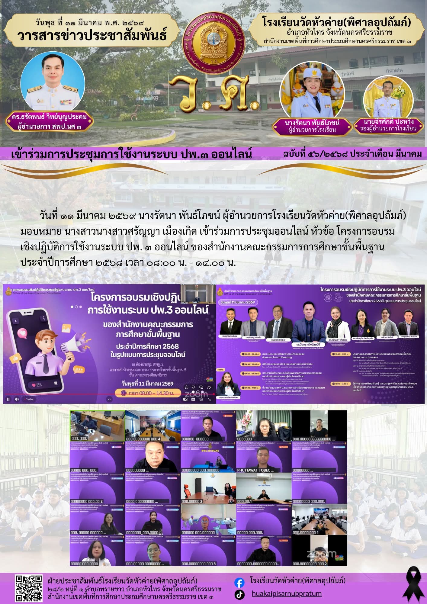 วันที่ ๑๑ มีนาคม ๒๕๖๙ นางรัตนา พันธ์โภชน์ ผู้อำนวยการโรงเรียนวัดหัวค่าย(พิศาลอุปถัมภ์) มอบหมาย นางสาวนางสาวศรัญญา เมืองเกิด เข้าร่วมการประชุมออนไลน์ หัวข้อ โครงการอบรมเชิงปฏิบัติการใช้งานระบบ ปพ. ๓...