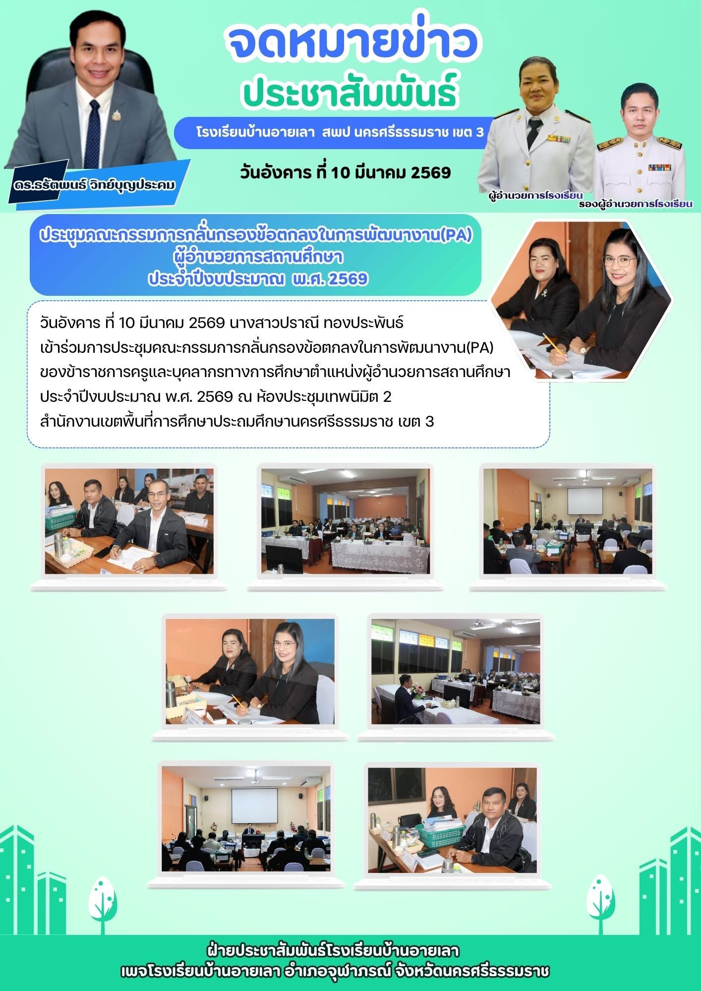 วันพุธที่ 11 มีนาคม 2569 นางสาวปราณี ทองประพันธ์ ผู้อำนวยการโรงเรียนบ้านอายเลา เข้าร่วมการประชุมซักซ้อมการประเมินผลการปฏิบัติงานของข้าราชการครูและบุคลากรทางการศึกษา ตำแหน่งผู้อำนวยการสถานศึกษา ครั้งที่ 1/2569 ณ ห้องประชุมเทพนิมิต สำนักงานเขตพื้นที่การศึกษาประถมศึกษานครศรีธรรมราช เขต...