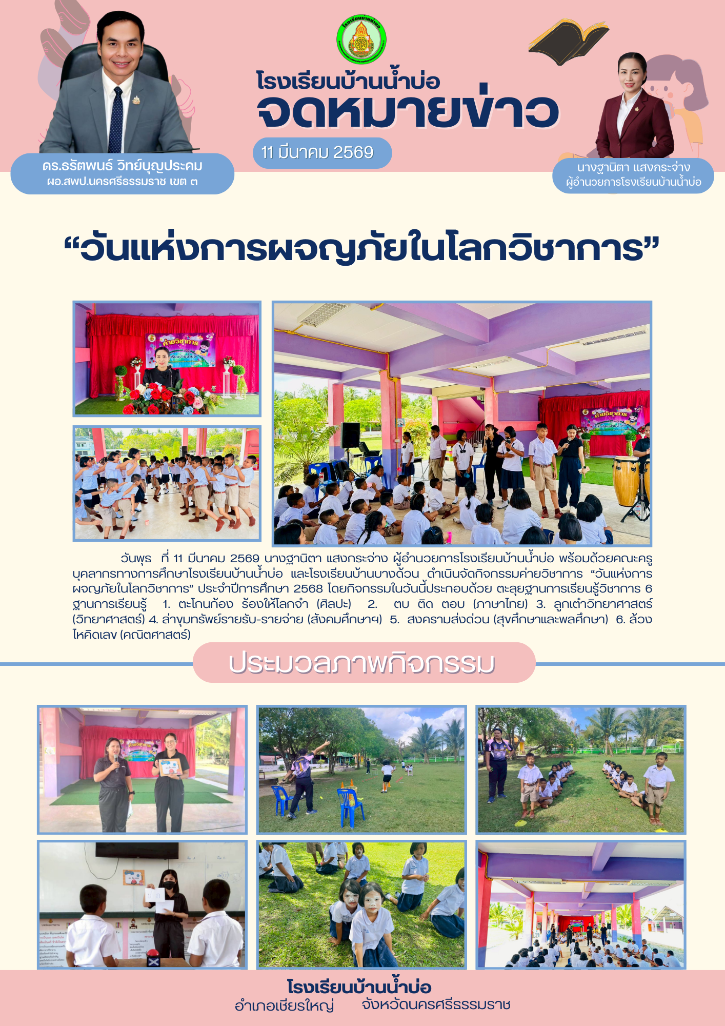 วันพุธ ที่ 11 มีนาคม 2569 นางฐานิตา แสงกระจ่าง ผู้อำนวยการโรงเรียนบ้านน้ำบ่อ พร้อมด้วยคณะครู บุคลากรทางการศึกษาโรงเรียนบ้านน้ำบ่อ และโรงเรียนบ้านบางด้วน ดำเนินจัดกิจกรรมค่ายวิชาการ “วันแห่งการผจญภัยในโลกวิชาการ” ประจำปีการศึกษา 2568...