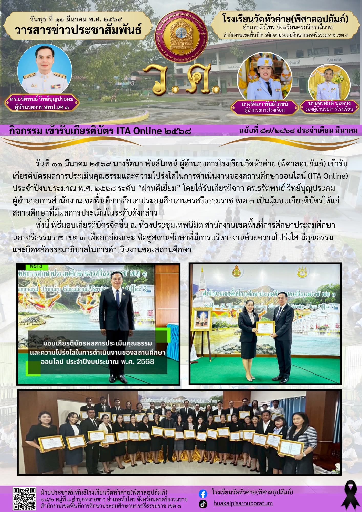 วันที่ ๑๑ มีนาคม ๒๕๖๙ นางรัตนา พันธ์โภชน์ ผู้อำนวยการโรงเรียนวัดหัวค่าย (พิศาลอุปถัมภ์) เข้ารับเกียรติบัตรผลการประเมินคุณธรรมและความโปร่งใสในการดำเนินงานของสถานศึกษาออนไลน์ (ITA Online) ประจำปีงบประมาณ พ.ศ. ๒๕๖๘ ระดับ...