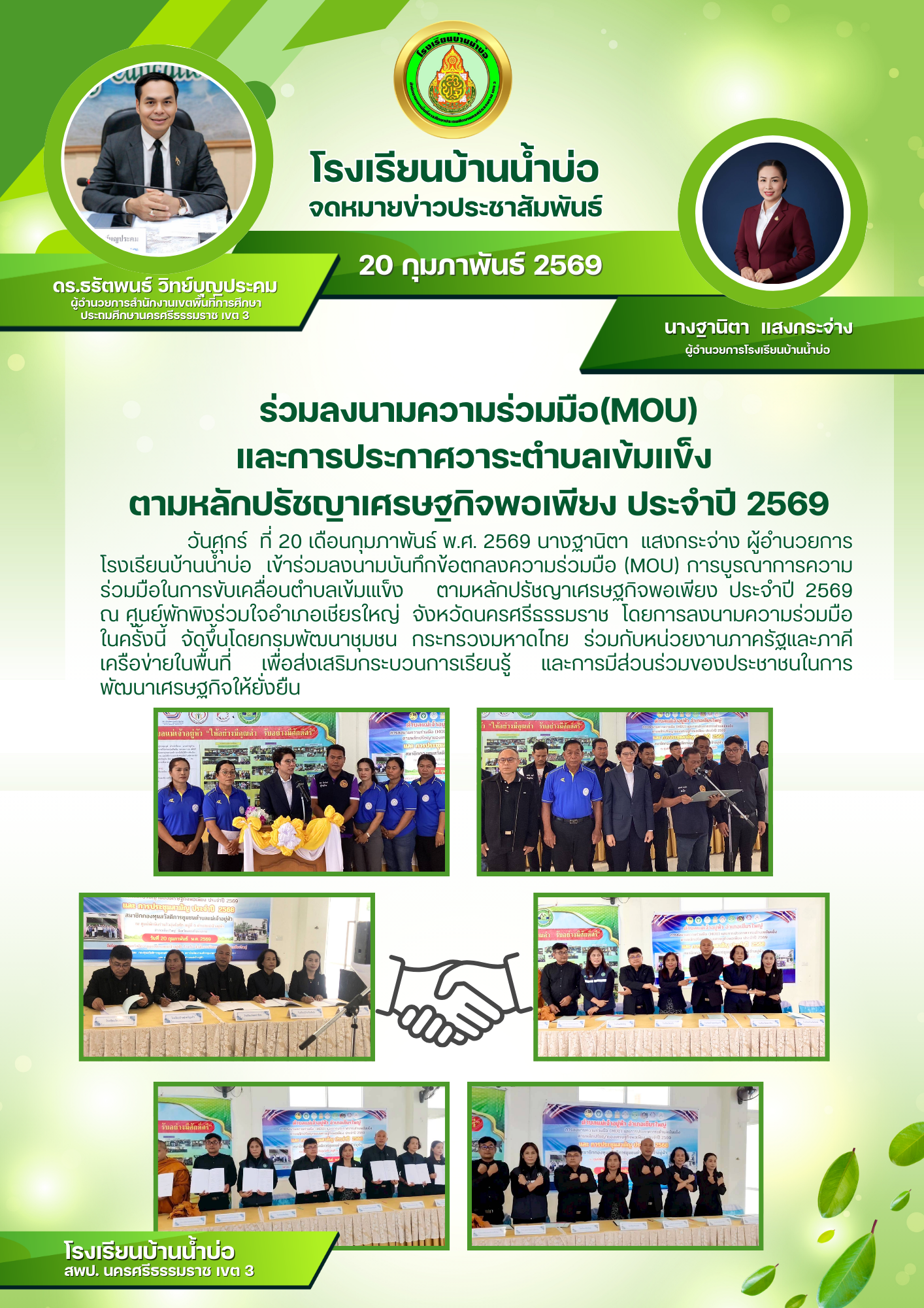 วันศุกร์ ที่ 20 เดือนกุมภาพันธ์ พ.ศ. 2569 นางฐานิตา แสงกระจ่าง ผู้อำนวยการโรงเรียนบ้านน้ำบ่อ เข้าร่วมลงนามบันทึกข้อตกลงความร่วมมือ (MOU) การบูรณาการความร่วมมือในการขับเคลื่อนตำบลเข้มเแข็ง ตามหลักปรัชญาเศรษฐกิจพอเพียง ประจำปี 2569...