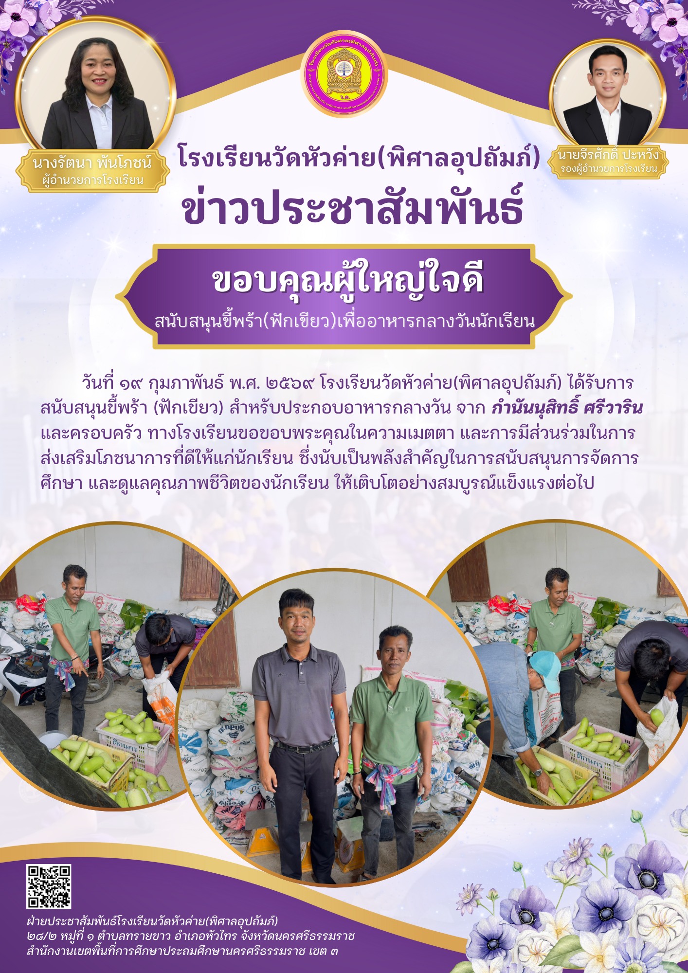 วันที่ ๑๙ กุมภาพันธ์ พ.ศ. ๒๕๖๙ โรงเรียนวัดหัวค่าย(พิศาลอุปถัมภ์) ได้รับการสนับสนุนขี้พร้า (ฟักเขียว) สำหรับประกอบอาหารกลางวัน จาก กำนันนุสิทธิ์ ศรีวาริน และครอบครัว ทางโรงเรียนขอขอบพระคุณในความเมตตา และการมีส่วนร่วมในการส่งเสริมโภชนาการที่ดีให้แก่นักเรียน...