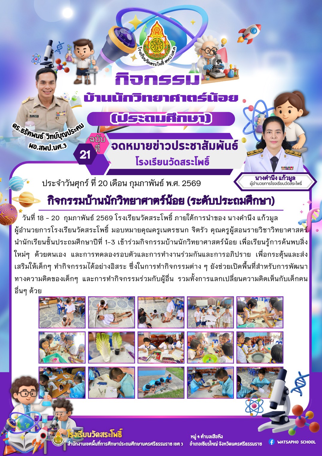 วันที่ 18 - 20 กุมภาพันธ์ 2569 โรงเรียนวัดสระโพธิ์ ภายใต้การนำของ นางคำนึง แก้วมูล ผู้อำนวยการโรงเรียนวัดสระโพธิ์ มอบหมายคุณครูเนตรชนก จิตรัว คุณครูผู้สอนรายวิชาวิทยาศาสตร์ นำนักเรียนชั้นประถมศึกษาปีที่...