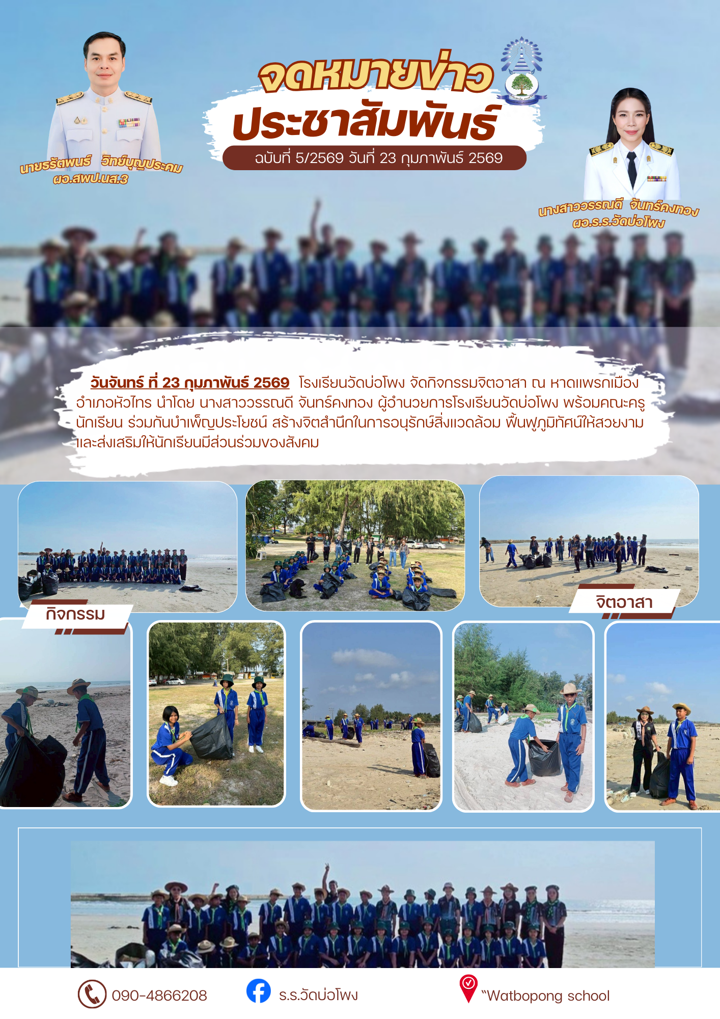 วันจันทร์ ที่ 23 กุมภาพันธ์ 2569 โรงเรียนวัดบ่อโพง จัดกิจกรรมจิตอาสา ณ หาดแพรกเมือง อำเภอหัวไทร นำโดย นางสาววรรณดี จันทร์คงทอง ผู้อำนวยการโรงเรียนวัดบ่อโพง พร้อมคณะครู...