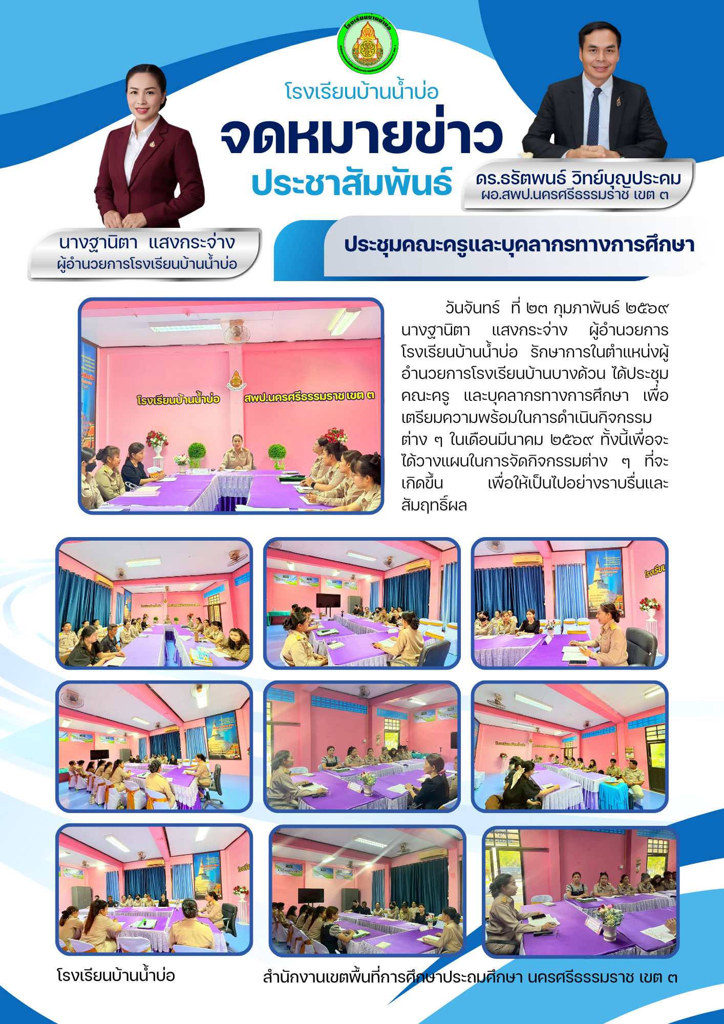วันจันทร์ ที่ ๒๓ กุมภาพันธ์ ๒๕๖๙ นางฐานิตา แสงกระจ่าง ผู้อำนวยการโรงเรียนบ้านน้ำบ่อ รักษาการในตำแหน่งผู้อำนวยการโรงเรียนบ้านบางด้วน ได้ประชุมคณะครู และบุคลากรทางการศึกษา เพื่อเตรียมความพร้อมในการดำเนินกิจกรรมต่าง ๆ ในเดือนมีนาคม ๒๕๖๙...