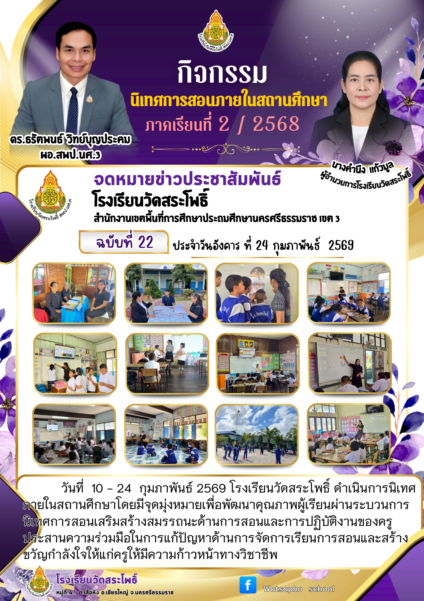 วันที่ 10 - 24 กุมภาพันธ์ 2569 โรงเรียนวัดสระโพธิ์ ดำเนินการนิเทศ ภายในสถานศึกษาโดยมีจุดมุ่งหมายเพื่อพัฒนาคุณภาพผู้เรียนผ่านระบวนการ นิเทศการสอนเสริมสร้างสมรรถนะด้านการสอนและการปฏิบัติงานของครู ประสานความร่วมมือในการแก้ปัญหาด้านการจัดการเรียนการสอนและสร้าง ขวัญกำลังใจให้แก่ครูให้มีความก้าวหน้าทางวิชาชีพ