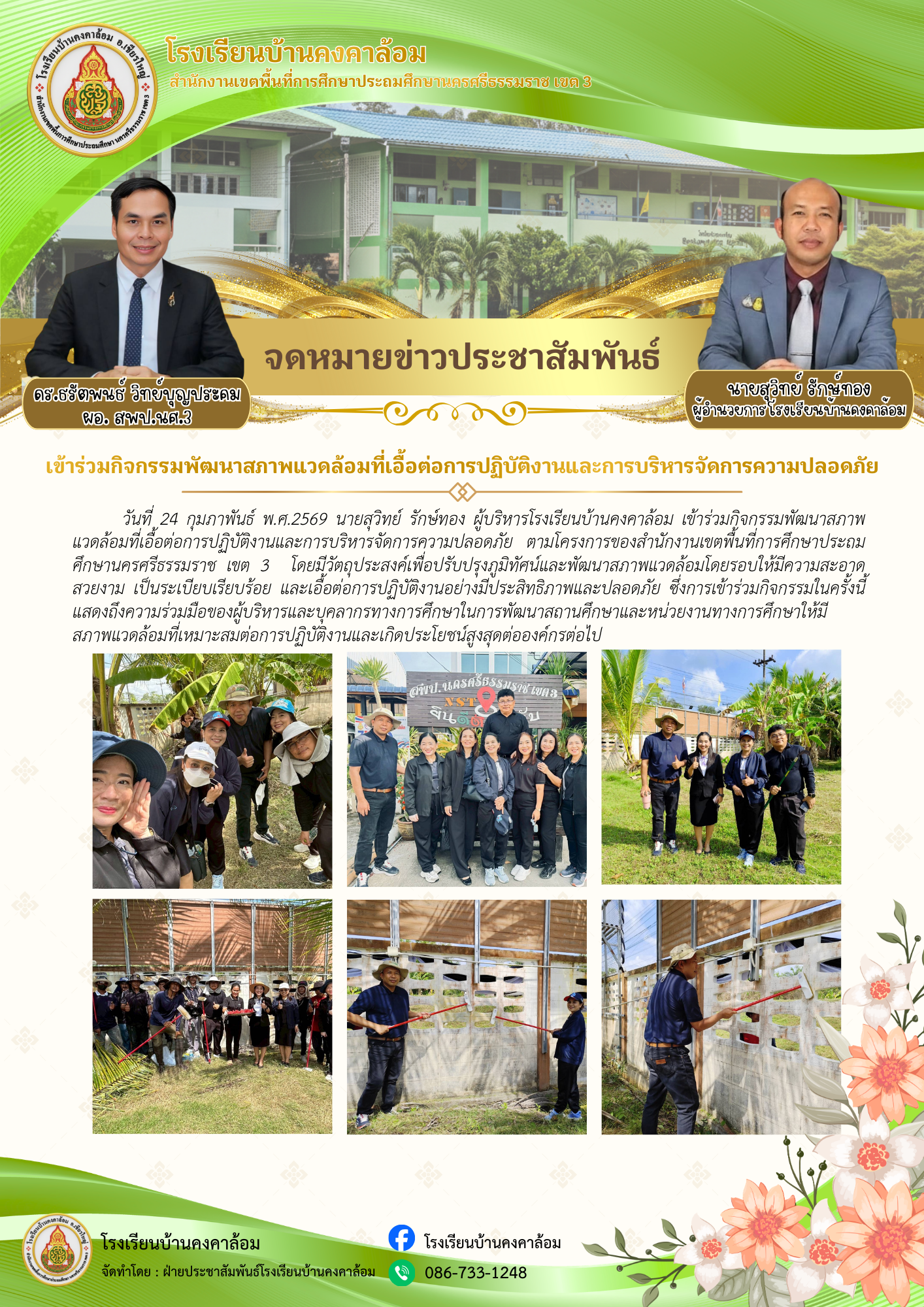 วันที่ 24 กุมภาพันธ์ พ.ศ.2569 นายสุวิทย์ รักษ์ทอง ผู้บริหารโรงเรียนบ้านคงคาล้อม เข้าร่วมกิจกรรมพัฒนาสภาพแวดล้อมที่เอื้อต่อการปฏิบัติงานและการบริหารจัดการความปลอดภัย ตามโครงการของสำนักงานเขตพื้นที่การศึกษาประถมศึกษานครศรีธรรมราช เขต 3 โดยมีวัตถุประสงค์เพื่อปรับปรุงภูมิทัศน์และพัฒนาสภาพแวดล้อมโดยรอบให้มีความสะอาด สวยงาม เป็นระเบียบเรียบร้อย และเอื้อต่อการปฏิบัติงานอย่างมีประสิทธิภาพและปลอดภัย...