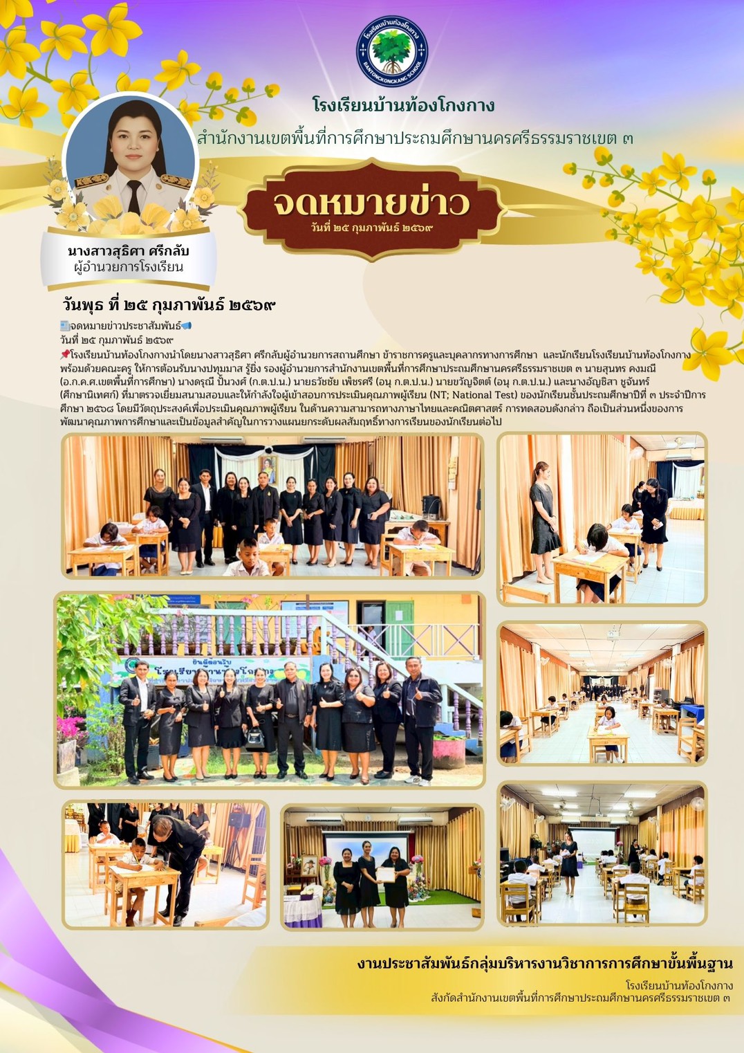 วันที่ 25 กุมภาพันธ์ 2569 นางประทุมมาส รู้ยิ่ง รองผู้ อํานวยการ สํานักงานเขตพื้นที่การศึกษาประถมศึกษานครศรีธรรมราชเขต 3 พร้อมคณะก.ต.ป.น ตรวจเยี่ยมสนามสอบโรงเรียนบ้านท้องโกงกางและให้กำลังใจผู้เข้าสอบการประเมินคุณภาพผู้เรียน (NT; National Test)...