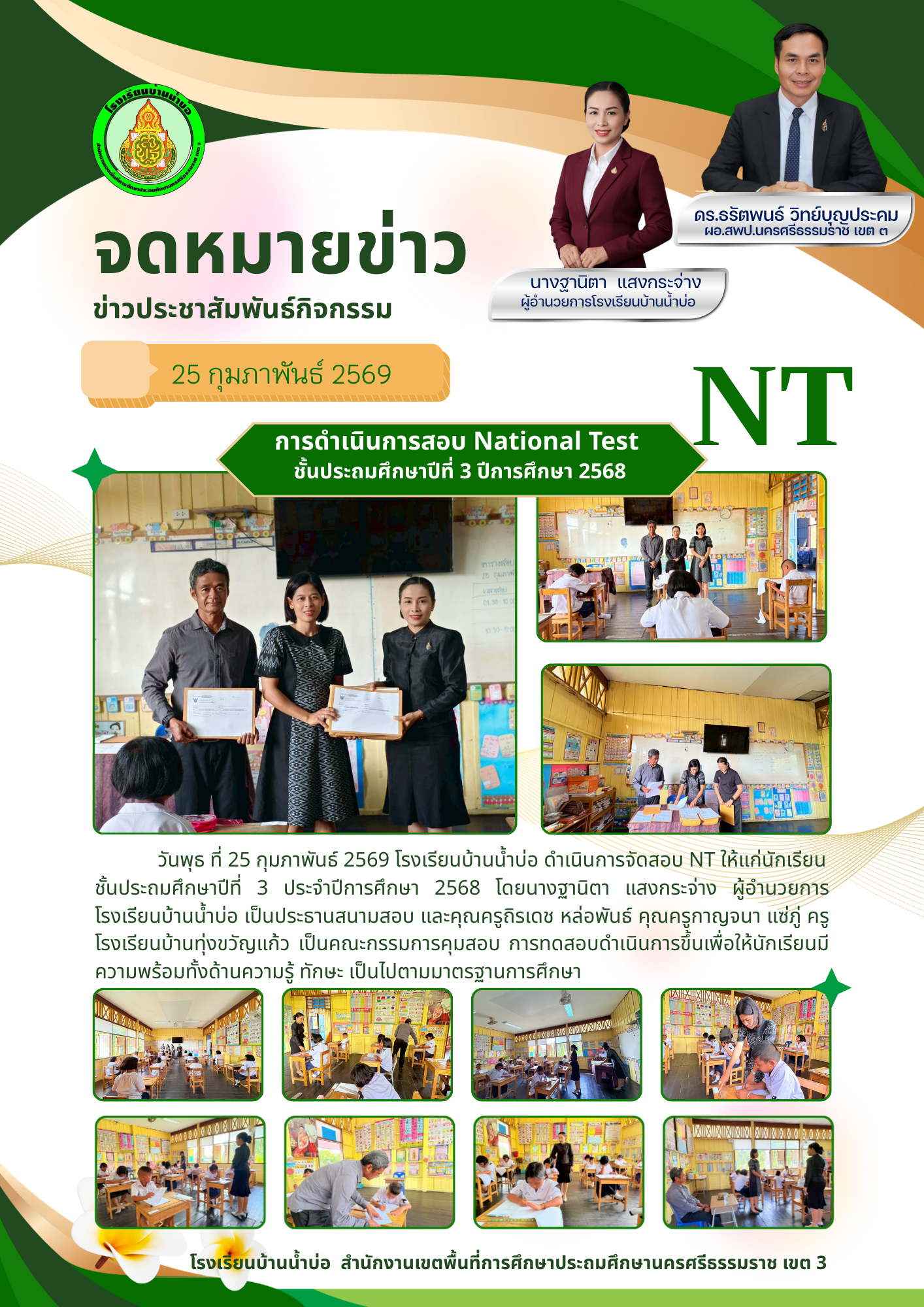 วันพุธ ที่ 25 กุมภาพันธ์ 2569 โรงเรียนบ้านน้ำบ่อ ดำเนินการจัดสอบ NT ให้แก่นักเรียน ชั้นประถมศึกษาปีที่ 3 ประจำปีการศึกษา 2568 โดยนางฐานิตา แสงกระจ่าง...
