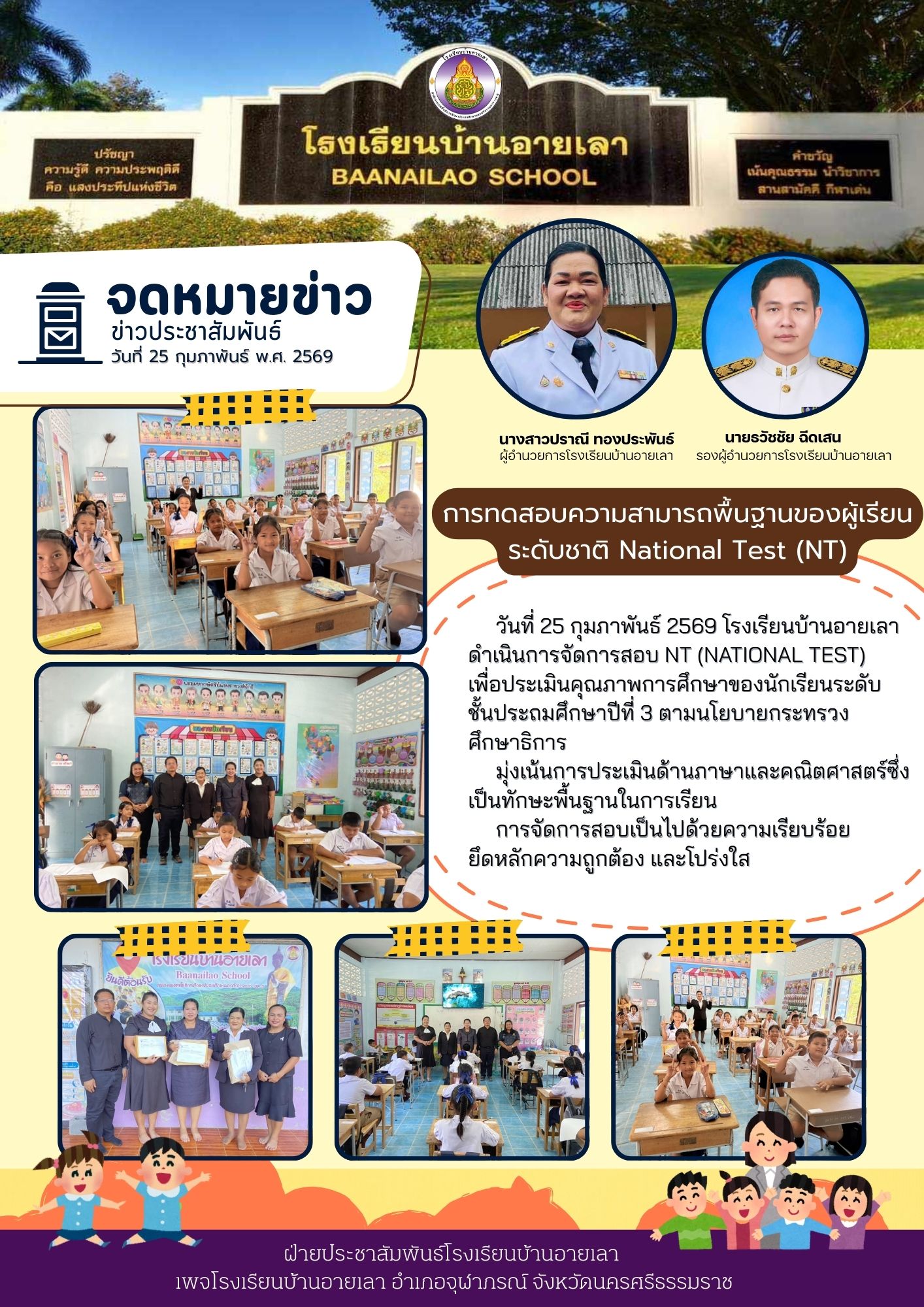 วันที่ 25 กุมภาพันธ์ 2569 โรงเรียนบ้านอายเลา ดำเนินการจัดการสอบ NT (National Test) เพื่อประเมินคุณภาพการศึกษาของนักเรียนระดับชั้นประถมศึกษาปีที่ 3 ตามนโยบายกระทรวงศึกษาธิการ มุ่งเน้นการประเมินด้านภาษาและคณิตศาสตร์ซึ่งเป็นทักษะพื้นฐานในการเรียน การจัดการสอบเป็นไปด้วยความเรียบร้อยยึดหลักความถูกต้อง และโปร่งใส