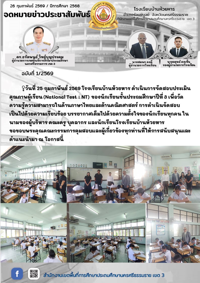 การสอบประเมินคุณภาพการศึกษาระดับชาติขั้นพื้นฐาน (National Test : NT) ปีการศึกษา 2568 นักเรียนชั้นประถมศึกษาปีที่ 3 // สภ.ชะอวดจัดกิจกรรมตามโครงการครู 5 นาทีหน้าเสาธง เพื่อแนะนำความรู้เกี่ยวกับกฎจราจร ประชาสัมพันธ์โครงการสวมหมวกนิรภัย...
