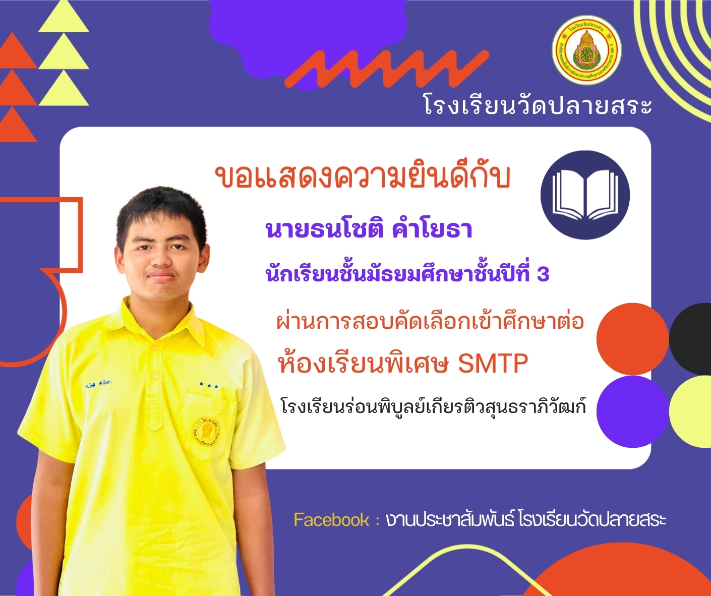 ขอแสดงความยินดี กับนักเรียนคนเก่ง นายธนโชติ คำโยธา ชั้น ม.3 ผ่านการสอบคัดเลือกเข้าศึกษาต่อ ห้องเรียนพิเศษ SMTP โรงเรียนร่อนพิบูลย์เกียรติวสุนธราภิวัฒก์
