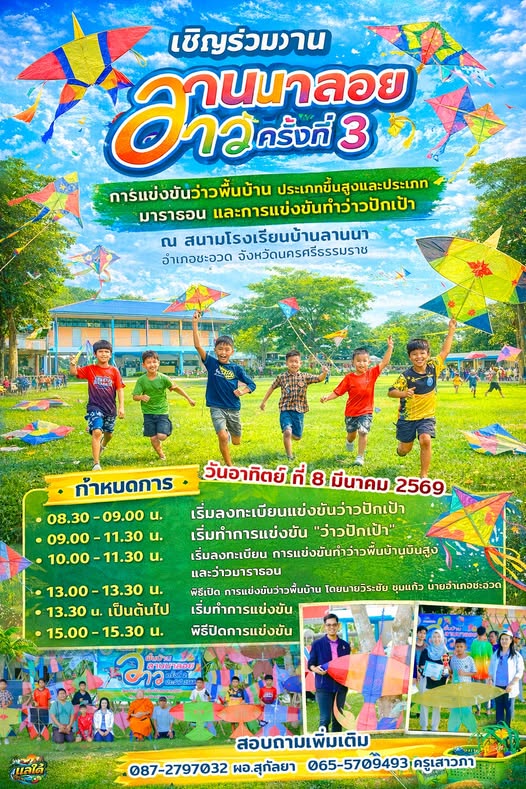 โรงเรียนบ้านลานนา ได้กำหนดจัดกิจกรรม “การแข่งขันว่าวพื้นบ้านลานนาลอย ครั้งที่ 3” โดยมีวัตถุประสงค์เพื่อส่งเสริมและอนุรักษ์ศิลปวัฒนธรรมการละเล่นว่าวพื้นบ้านของไทยให้คงอยู่สืบไป ในวันอาทิตย์ที่ 8 มีนาคม 2569 ณ สนามกีฬาโรงเรียนบ้านลานนา