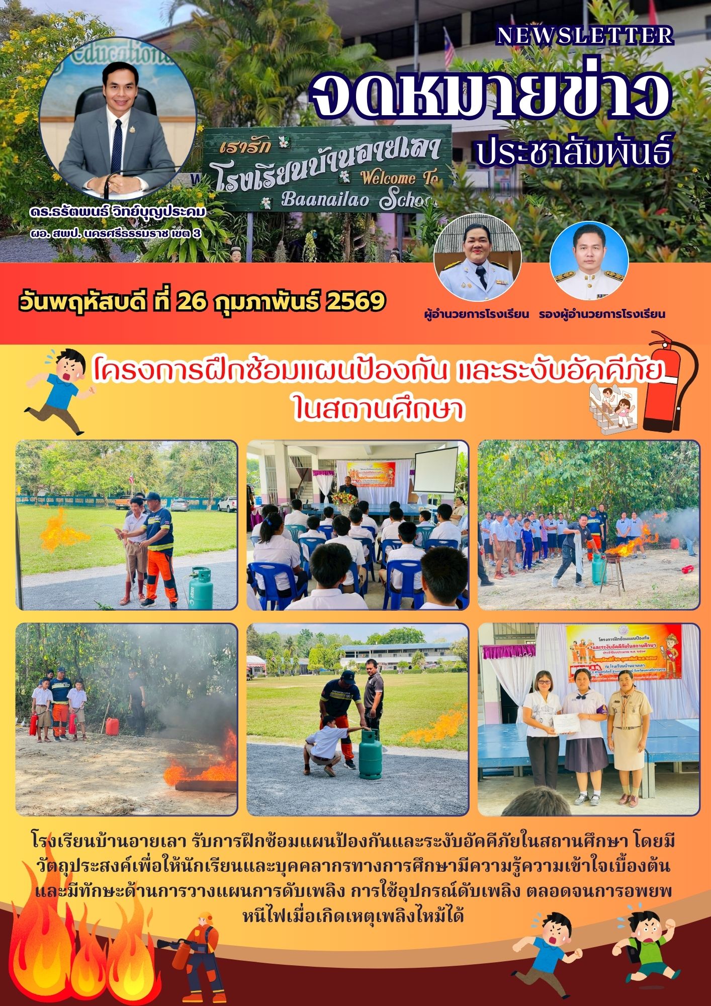 โรงเรียนบ้านอายเลา รับการฝึกซ้อมแผนป้องกันและระงับอัคคีภัยในสถานศึกษา โดยมีวัตถุประสงค์เพื่อให้นักเรียนและบุคคลากรทางการศึกษามีความรู้ความเข้าใจเบื้องต้น และมีทักษะด้านการวางแผนการดับเพลิง การใช้อุปกรณ์ดับเพลิง ตลอดจนการอพยพหนีไฟเมื่อเกิดเหตุเพลิงไหม้ได้