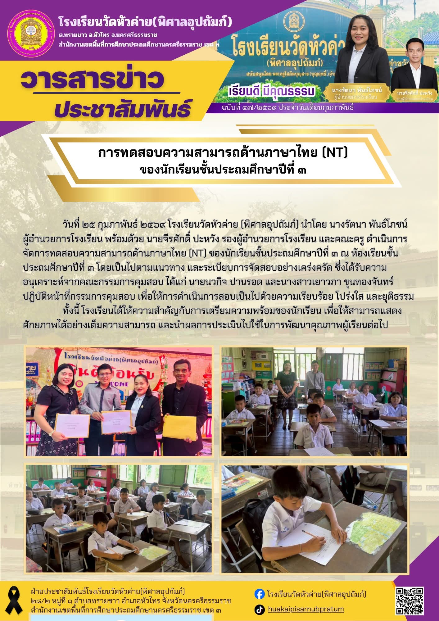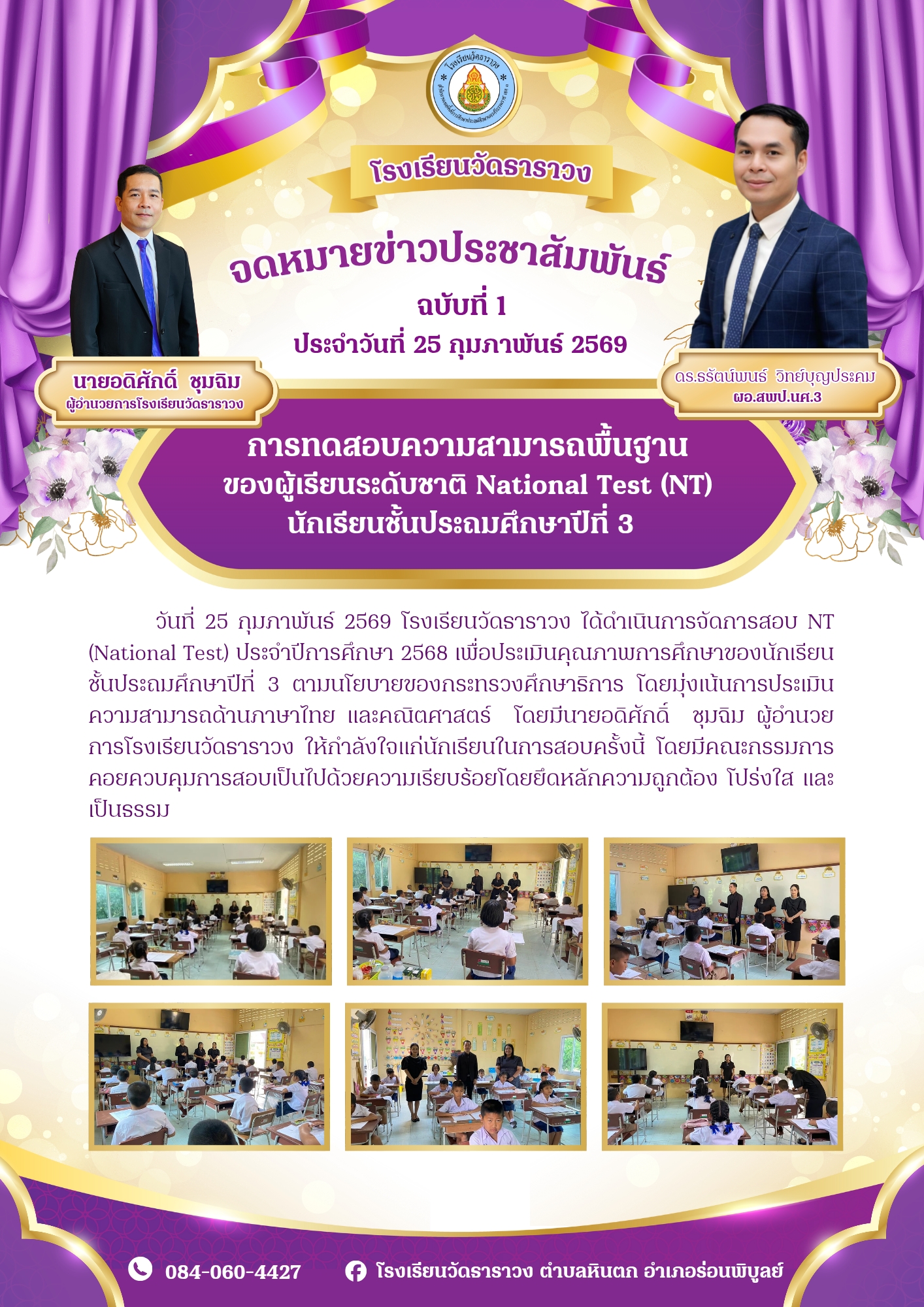 วันที่ 25 กุมภาพันธ์ 2569 โรงเรียนวัดธาราวง ได้ดำเนินการจัดการสอบ NT (National Test) ประจำปีการศึกษา 2568 เพื่อประเมินคุณภาพการศึกษาของนักเรียนชั้นประถมศึกษาปีที่ 3 ตามนโยบายของกระทรวงศึกษาธิการ โดยมุ่งเน้นการประเมินความสามารถด้านภาษาไทย...
